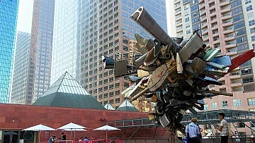 83년 개핀 컨템퍼러리가 오픈한 뒤 3년 후인 86년 캘리포니아 플라자 빌딩에 제2의 MOCA가 선을 보였다. 작품 전시공간의 넓이나 효과 등을 고려할 때 두 건물 중에서 MOCA를 대표하는 곳은 개핀 컨템퍼러리이겠으나 시민들에게는 캘리포니아 플라자 빌딩의 MOCA가 더 잘 알려져 있다. 일본계 건축가 아라타 이조자키가 설계한 독특한 건축형태도 눈길을 끈다. 마천루 숲으로 둘러싸인 미술관 광장에 우뚝 솟은 비행기 잔해 고철 묶음 같은 거창하고 거친 설치미술은 Nancy Rubins라는 여성작가 작품이라서 놀라웠다. 전시실로 내려가자 미술 교과서에서 친숙해진 자코메티의 조각 한 쌍이 반색을 했고 물감을 뿌리거나 쏟아붓는 잭슨 폴록의 캔버스가 그나마 친숙했다. 마크 로스코 컬렉션 홀에서는 의자에 앉아 느긋하게 쉬는 여유도 부렸다.