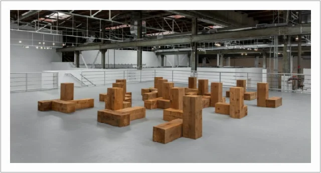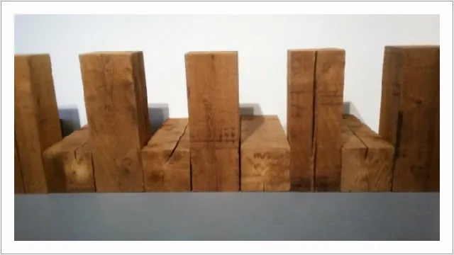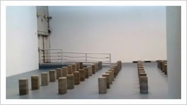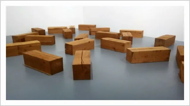 운동장 같은 공간에 몇 개 벽돌과 원목이 널려있고 작가와 작품 제목은 어느 한 면에 숨은 그림 찾기 시키듯 아주 작고 희미하다.