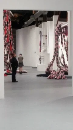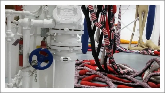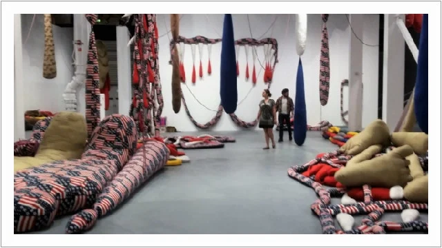 Sterling Ruby의 거대한 설치 미술인 'SOFT WORK'는 성조기 문양을 가진 섬유를 사용하여 신체를 불안정하게 표현한 인형 조각을 대량 설치해뒀다.
