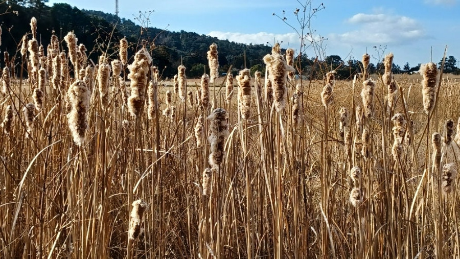 키대로 자란 부들 열매가 꺼벙하게 부풀려져 바람에 씨앗을 날려 보내고 있다.