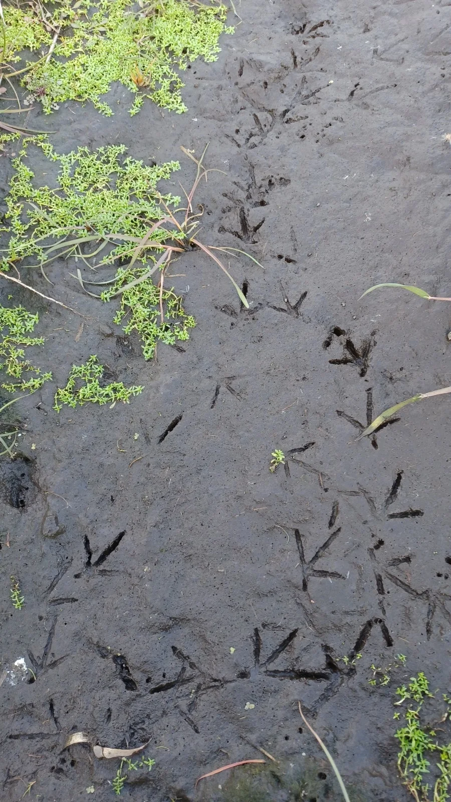 습지 옆의 늪지대에 나있는 발자취, 기러기나 오리류 새 발자국이기보다 아주 큼직한 새인 두루미며 고니 발자국일까?