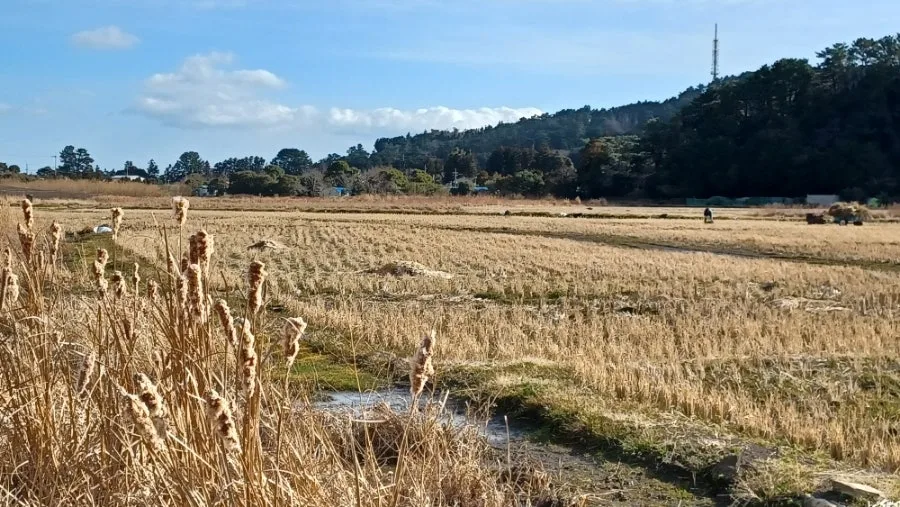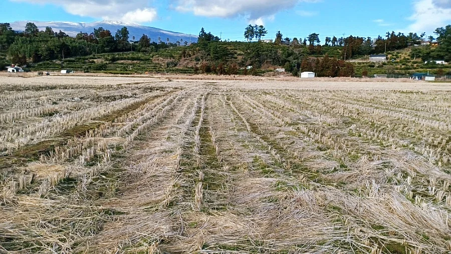 그럼 수확할 때 볏짚도 동시에 다 수거되는 거 아니냐 묻자, 시에서 볏짚을 돈 내고 사용하기 때문에 그냥 놔둔단다.