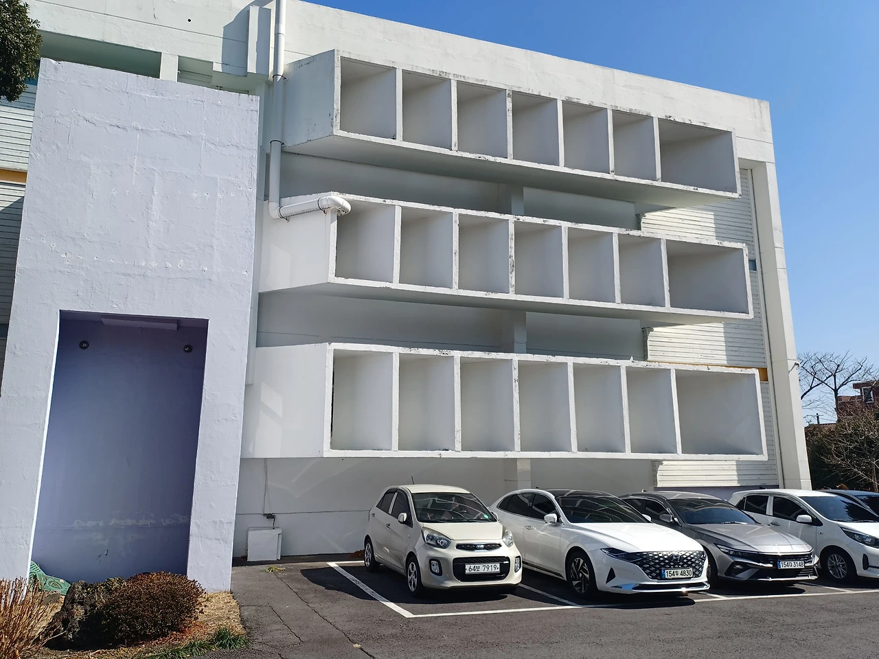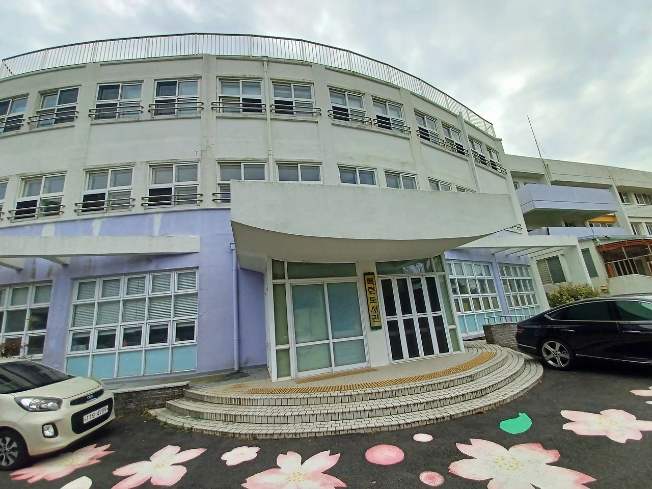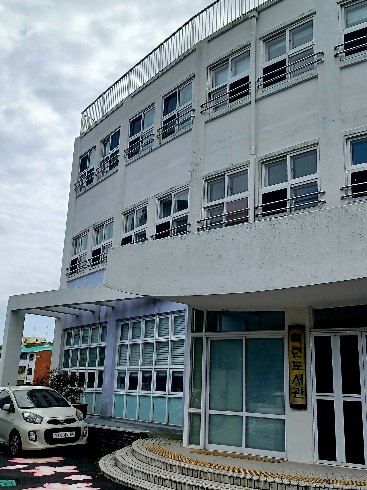 서귀포의료원과 접한 북쪽의 도서관 건물은 김중업의 트레이드마크인 직사각형이 아닌 반 원통형 건물.