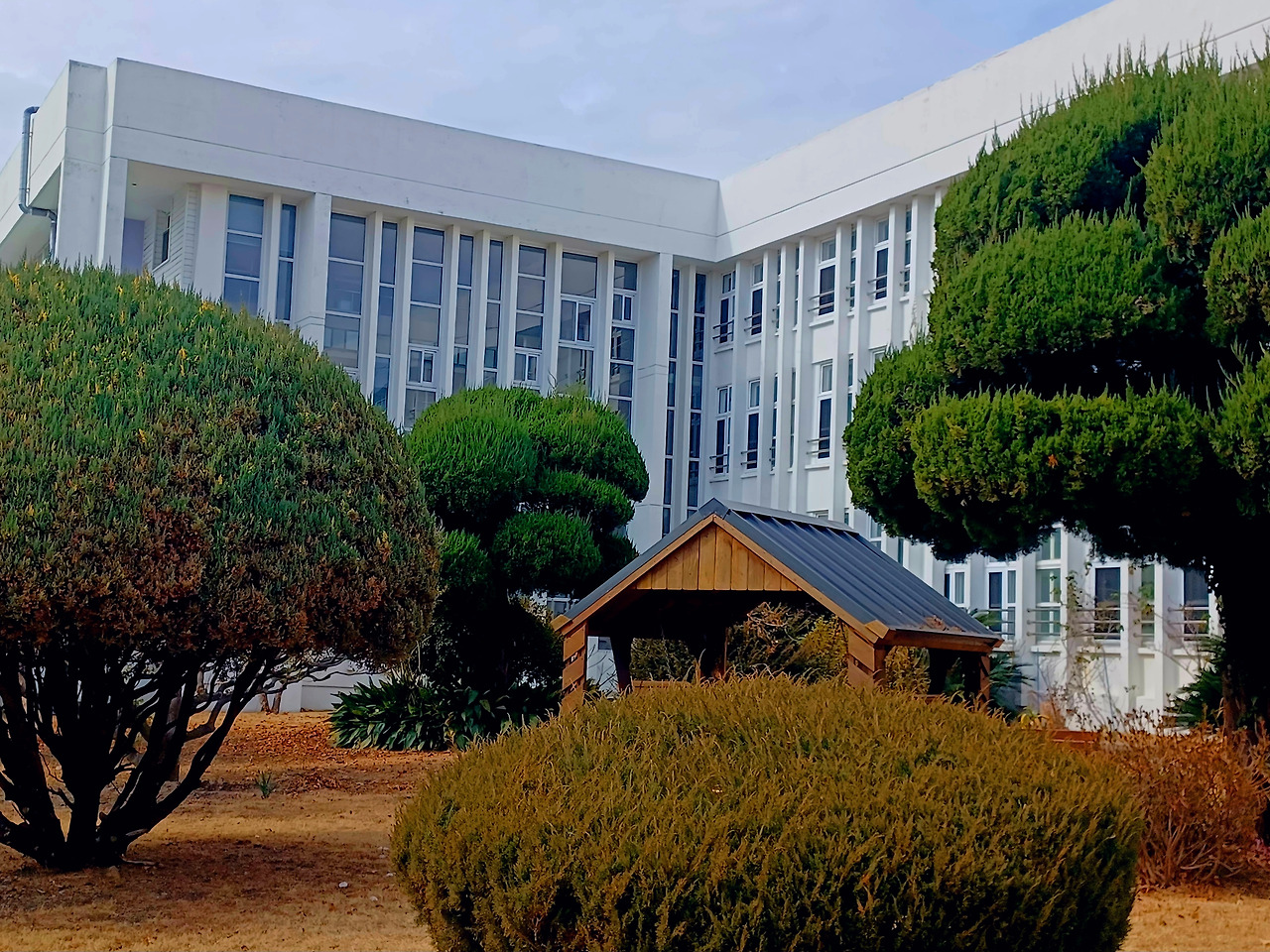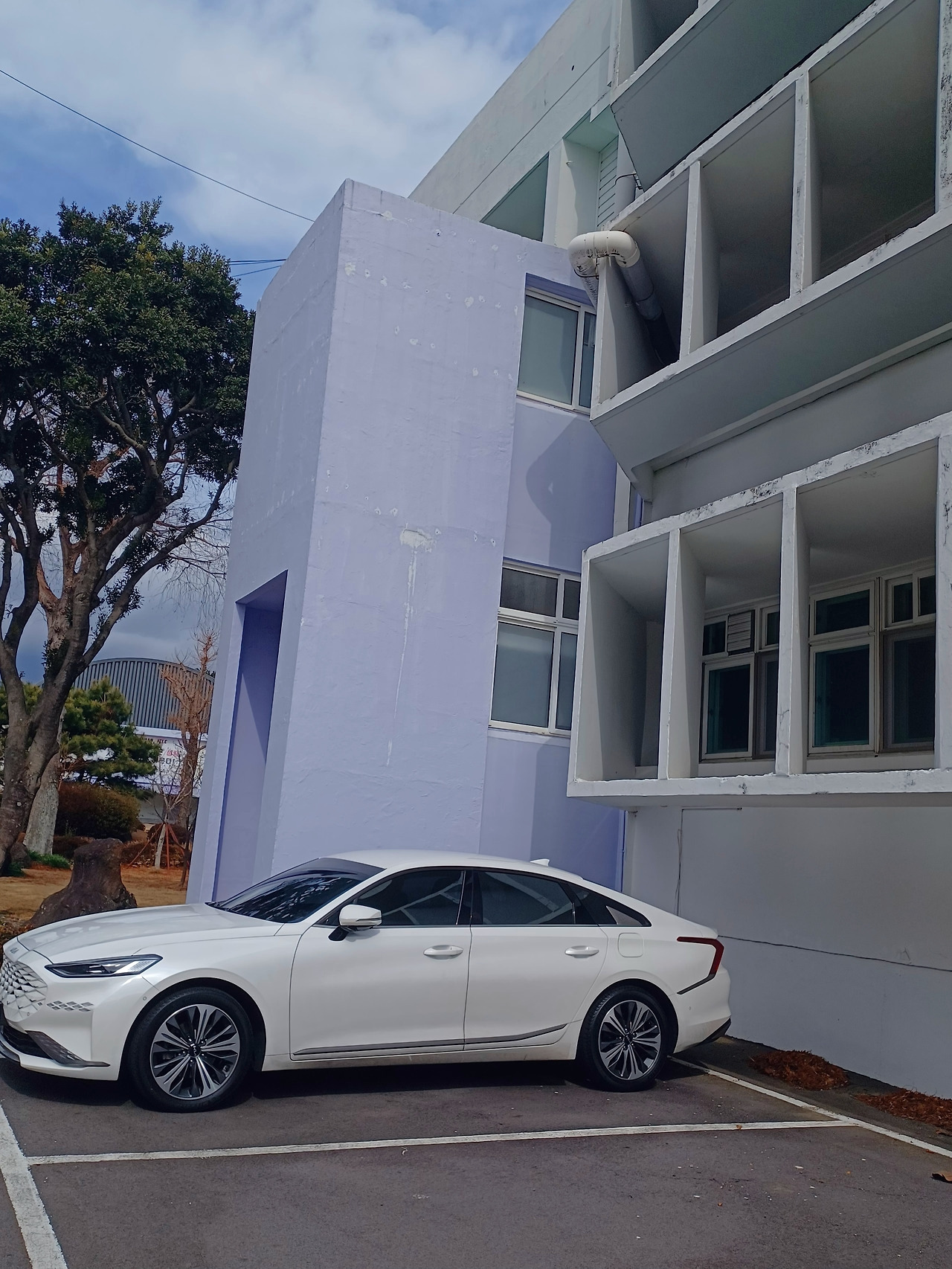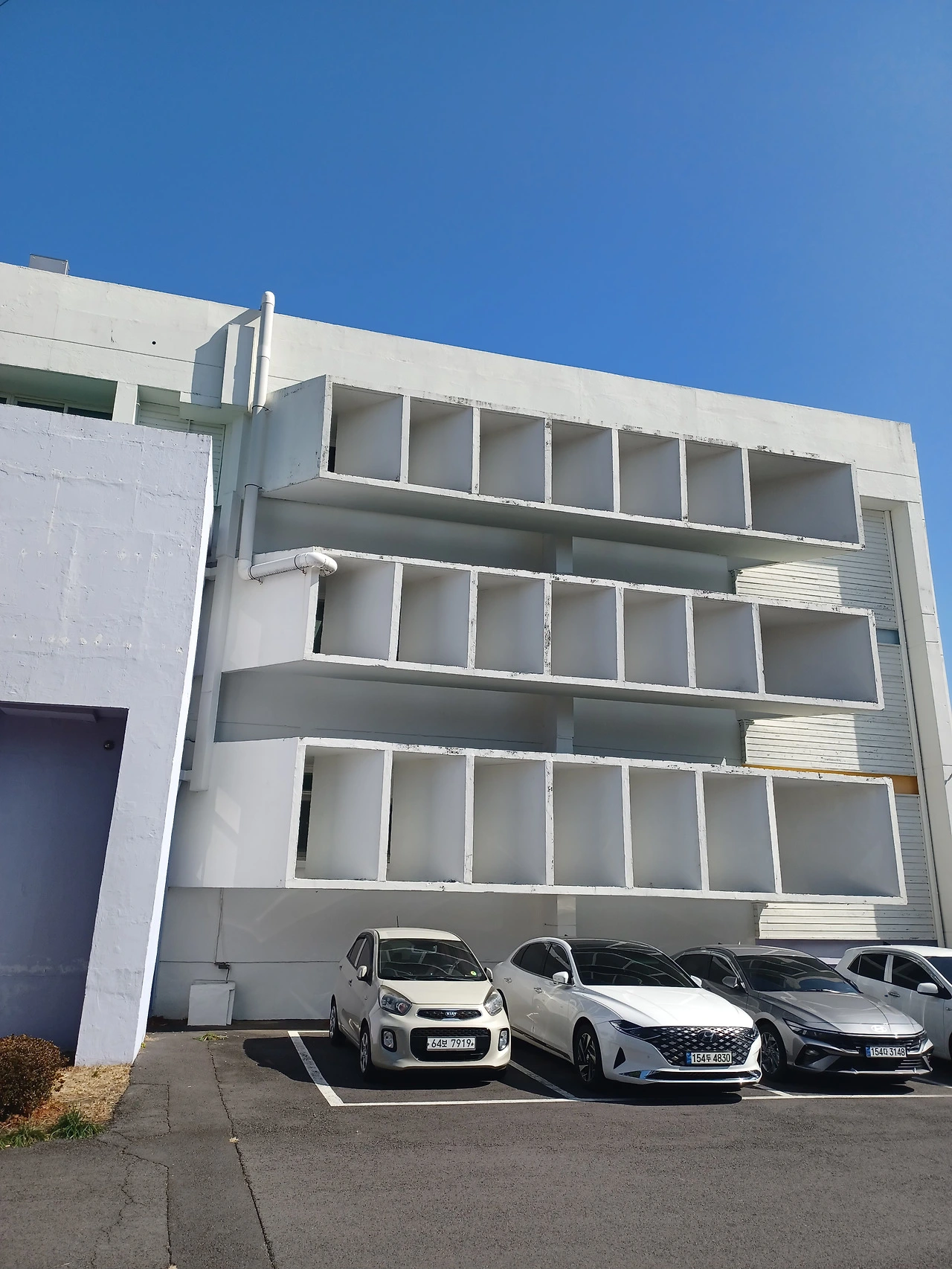 서귀포의료원과 접한 북쪽의 도서관 건물은 김중업의 트레이드마크인 직사각형이 아닌 반 원통형 건물.