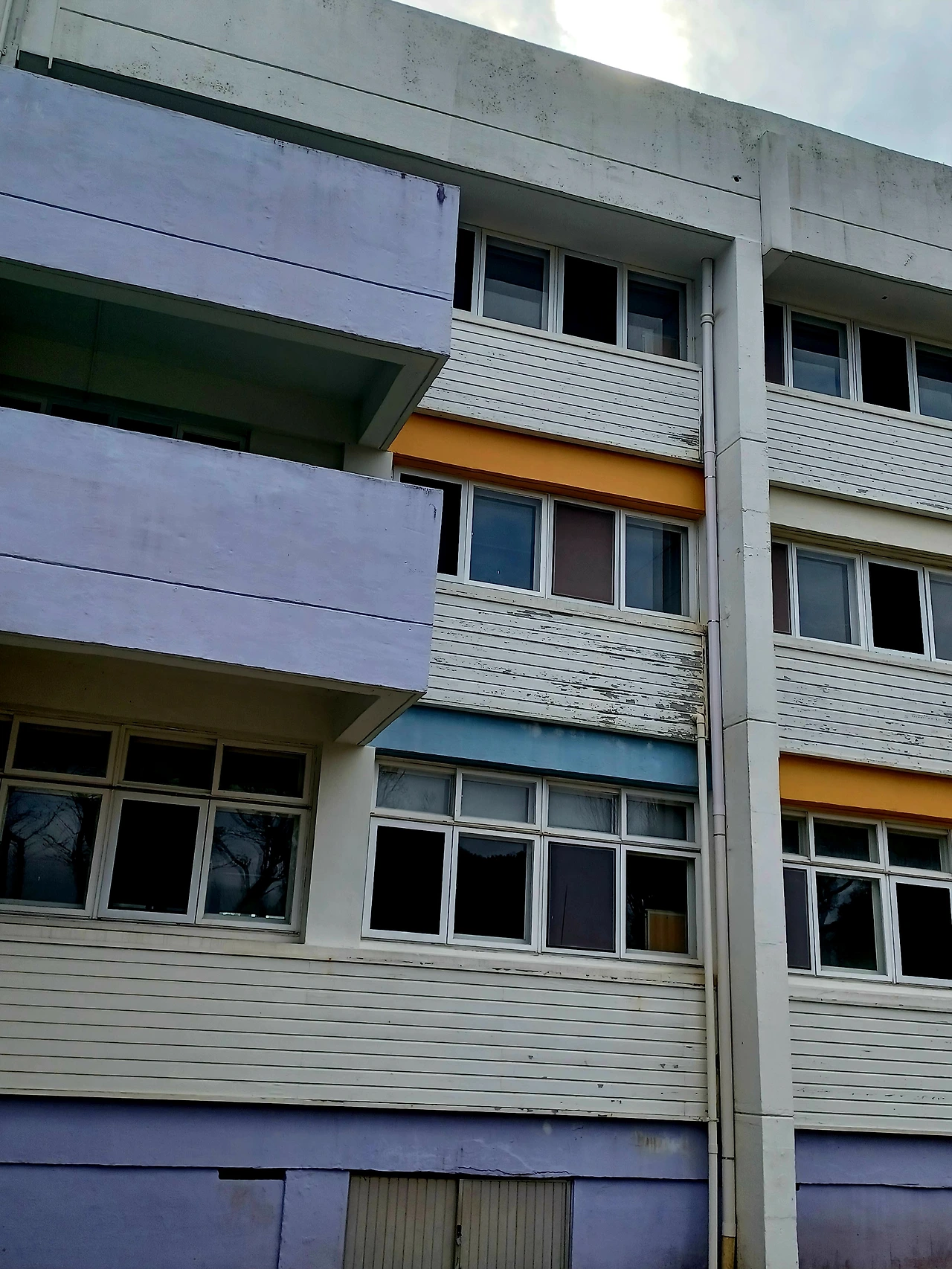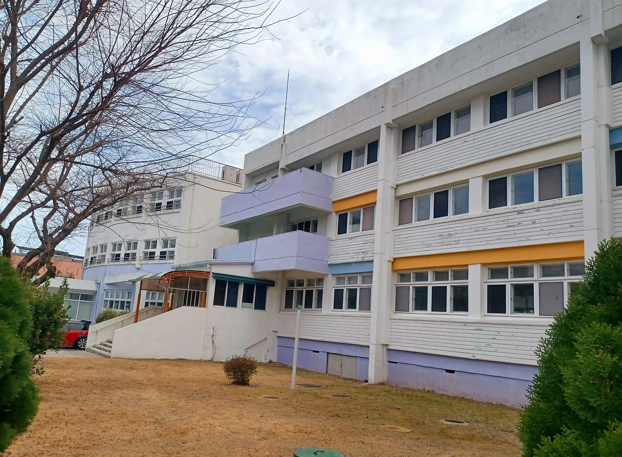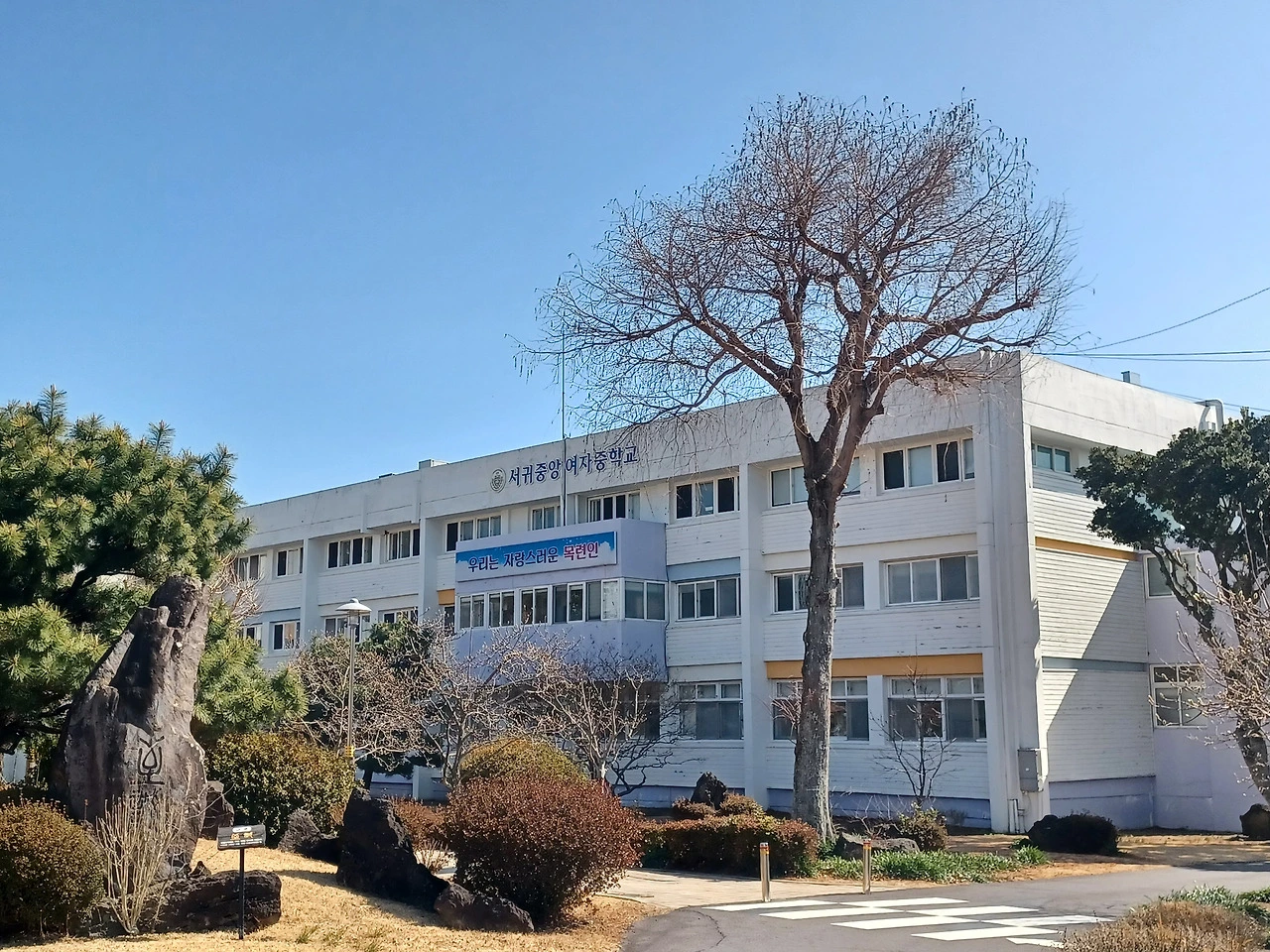 서귀포 시청사 맞은편에 위치한 서귀중앙여중 교사는 접하는 방향마다 표정이 다르다.