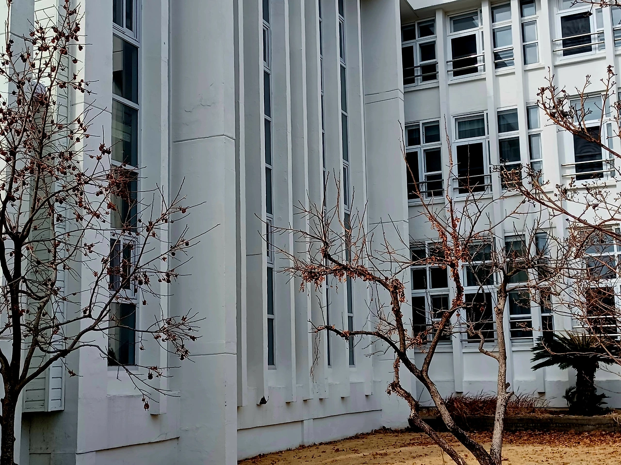 학교라 평일에는 수업시간일 터, 내부 관람이 제한되므로 외부에서 건축의 조형미를 먼저 느껴보기로 했다.