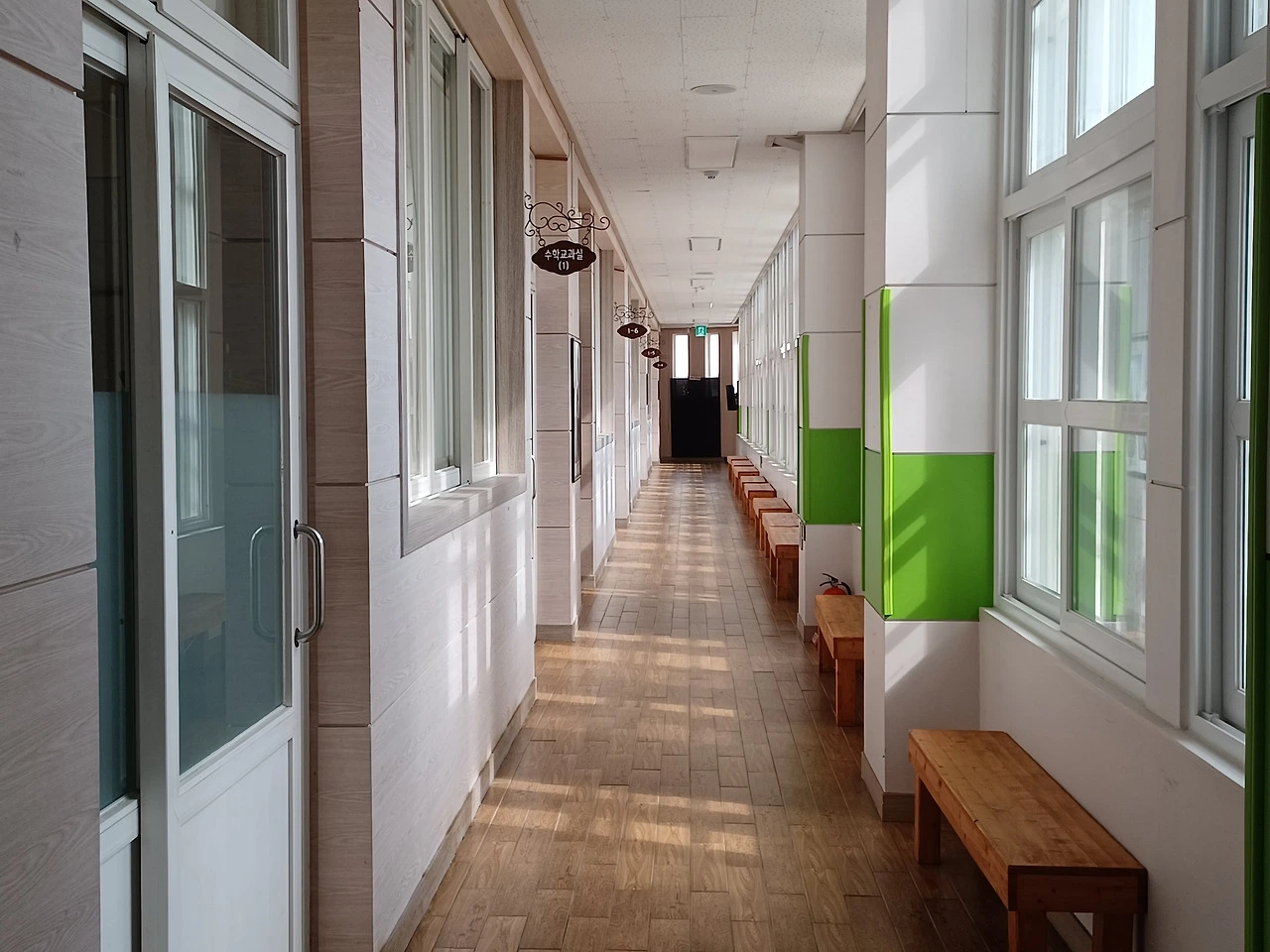 교사 남쪽에 나있는 두 개의 주 현관도 서로 다른 모습이고, 앞뒤로 보이는 교실 창문 프레임도 일정하지가 않다.