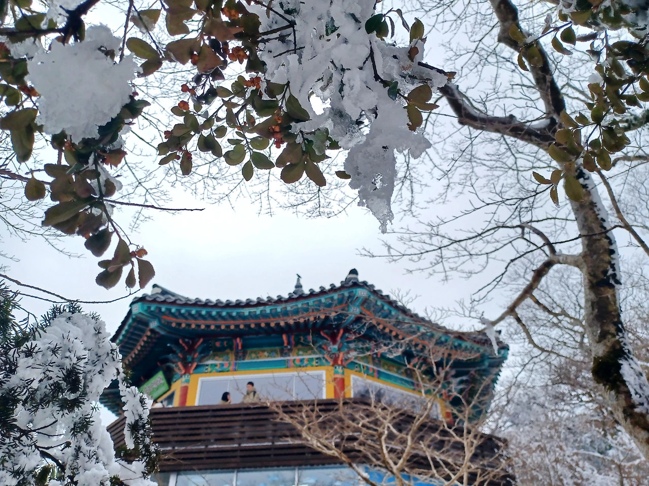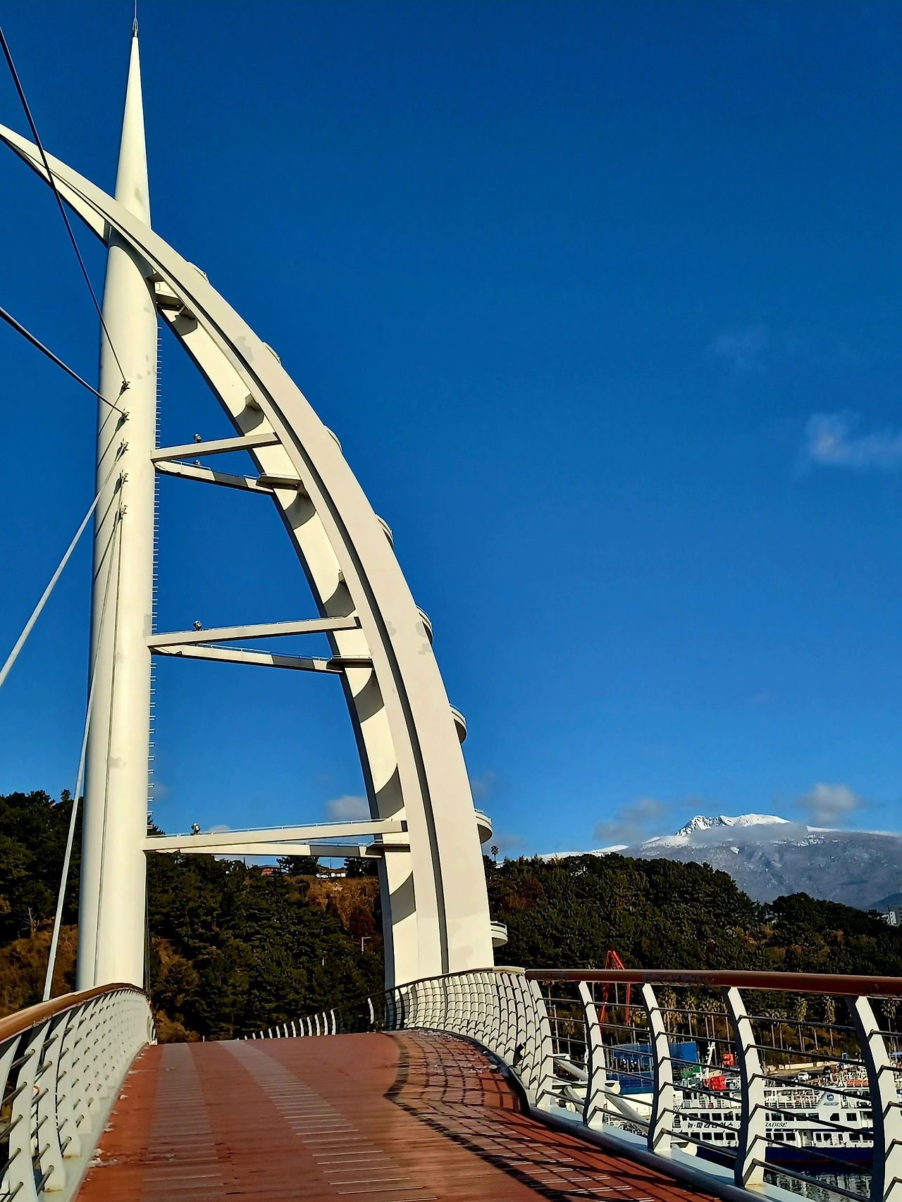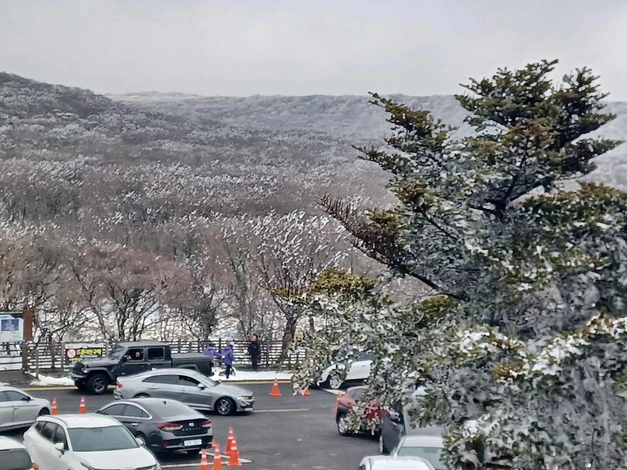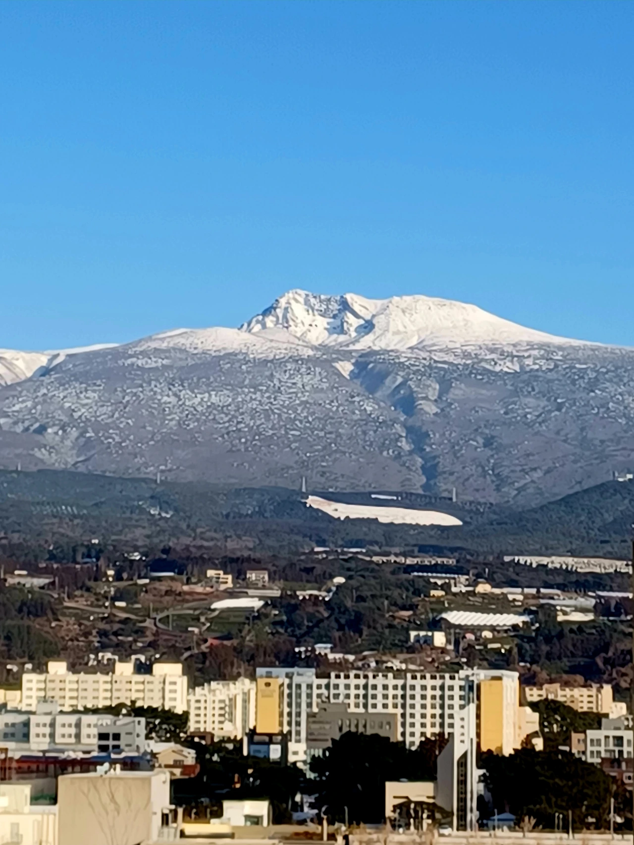 월요일 아침, 어제 항공편 결항도 있었다는데 언제 그랬냐 싶을 정도로 눈부시게 쾌청한 날씨였다. 서귀포 새연교에서 올려다본 한라산은 하얗게 분단장을 하고 있었다. 꼭 그리 보였다, 설문대할망이 아니라 새 신부가 곱게 치장하고 사틴 면사포 살풋 쓴 듯이. 새하얀 백록담이 겨울 햇살 아래 오연스레 빛났다. 저 위에 올라가면 얼마나 멋진 풍광이 기다릴 텐가. 부푼 설렘과 기대 품게 할 만큼 설경은 매혹적이었다. 시선은 자꾸 산으로 향했다. 날씨가 너무 화창해 눈이 녹지나 않을까 조바심이 났다. 그래도 차질 없이 오전일을 마치고 서둘러 눈꽃버스를 탔다.