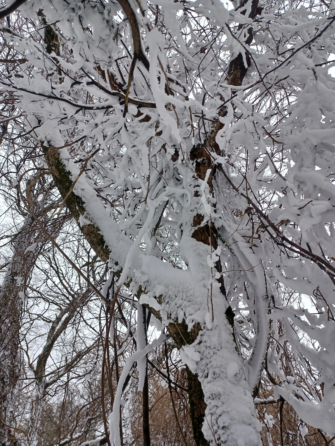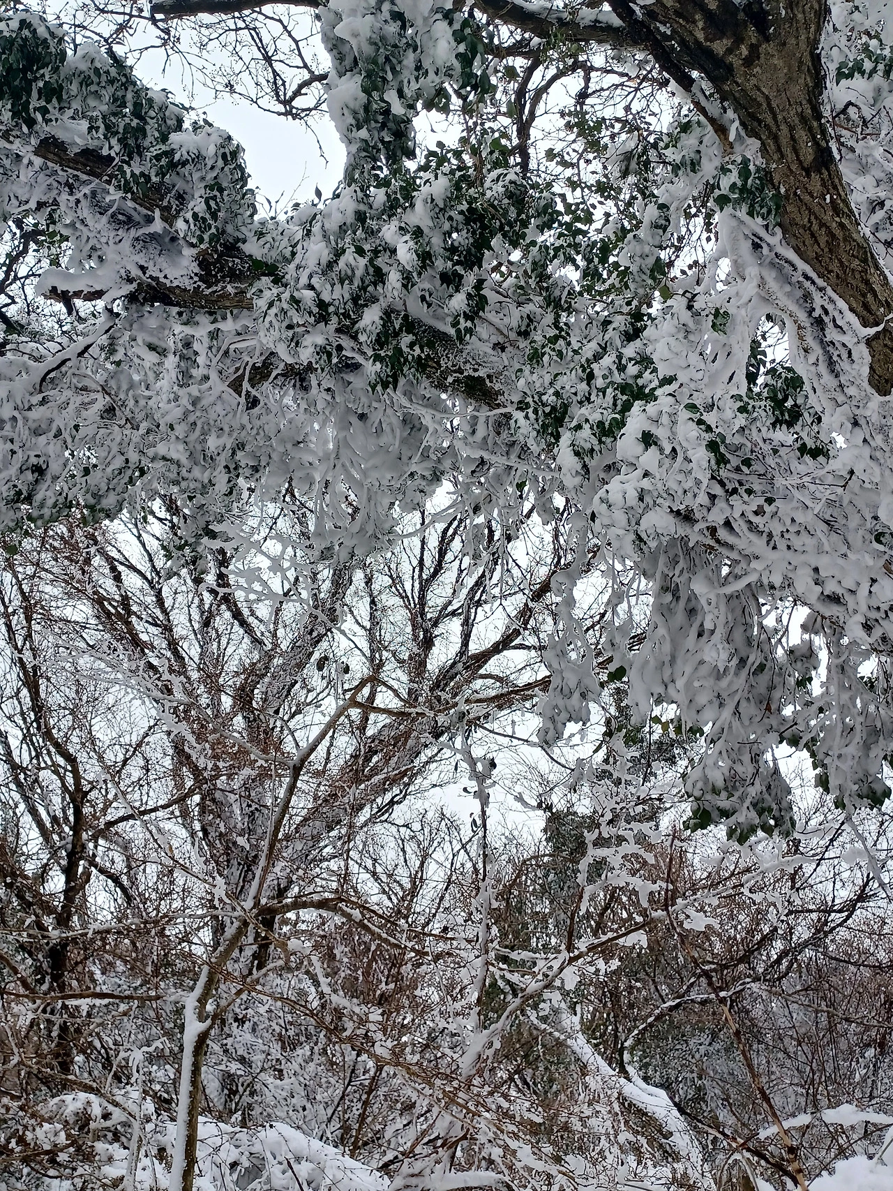 천백 도로 초입 위호텔에서부터 고도 높여갈수록 세상이 달라졌다. 우선 적설량부터 눈에 띄게 많아졌다. 아래는 여전히 봄날처럼 햇살 청명했으나 위로 올라가면서 기온 완연히 달라지는 것이 느껴졌다. 눈구름이 장악한 회색 하늘, 영실 지나 1100 고지에 이르자 차량과 인파로 도로는 혼잡했다. 올라오면서 대강 감이 왔지만 아니나 다를까. 나뭇가지에 앉았던 눈꽃은 더는 얼음꽃이 아니었다. 햇빛 나자 흰 결정은 풀어지고, 그새 투명한 물방울로 변해버렸다. 그렇게 설화는 오전 햇살에 거진 녹아 무화됐다. 모든 것은 이처럼 서로 연결되어 있으면서 서로에게 유형 무형으로 영향을 미친다. 독립적으로 존재하는 건 그 무엇도 없다고 하였다. 공명의 법칙에 따라, 연기의 법칙에 의해, 한때 만났다 스러지는 인연이 ㄱ.러하듯. 소음 속에서도 눈 녹아내리는 소리 또렷했다. 눈꽃은 아직 겨울이라는데, 떨어지는 물소리는 이미 봄이었다. 백록상이 선 숲으로 들어갔다. 전망대 뒤쪽은 여전 나무마다 설화 소담스러웠다. 바람 한 점 없는 고요 속에서 나뭇가지들은 하얀 꽃을 이고 조용히 서 있었다. 세상에나, 이리 정결한 아름다움이 날 기다리고 있었다니 고맙구나.