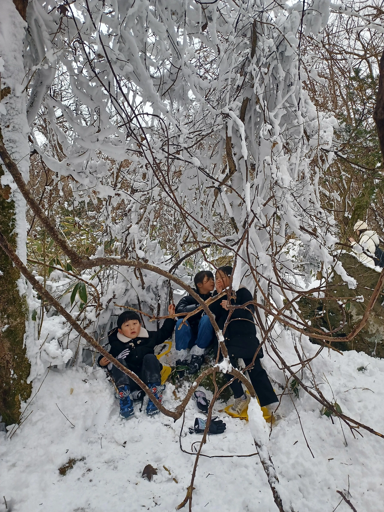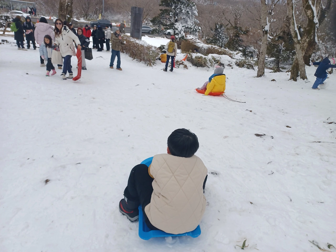 그러나 천백고지 하늘은 우울한 회색빛으로 흐려 있었다. 두터운 눈안개가 사방을 감싸고 휘돌며 뭇 풍경을 지워냈다. 아랫녘에서 올려다본 맑은 하늘은 흔적 없이 사라지고, 천백고지는 완연히 다른 세계였다. 저 멀리 보이던 설경도, 한라의 정상도, 모두 구름 속으로 사라졌다. 멀리서 보는 것과 그 안에 들어서서 보는 풍경은 전혀 다른 느낌이었다. 기대했던 조망 대신 만난 짙은 안개. 그러나 실망하지 않았다. 오히려 이것이 영산의 진면목에 더 가까웠기에. 산은 제 속내를 쉽게 보여주지 않았다. 그래서 더 그다웠다고나 할까. 눈밭에서 아이들은 신나게 눈썰매를 탔으며 젊은이들은 제 방식대로 겨울동화를 연출하고 있었다
