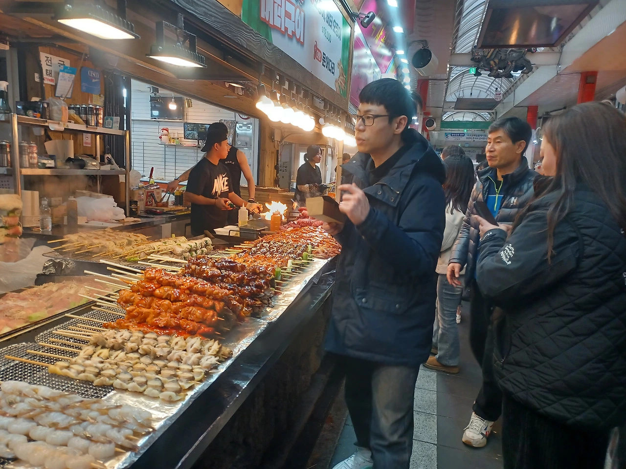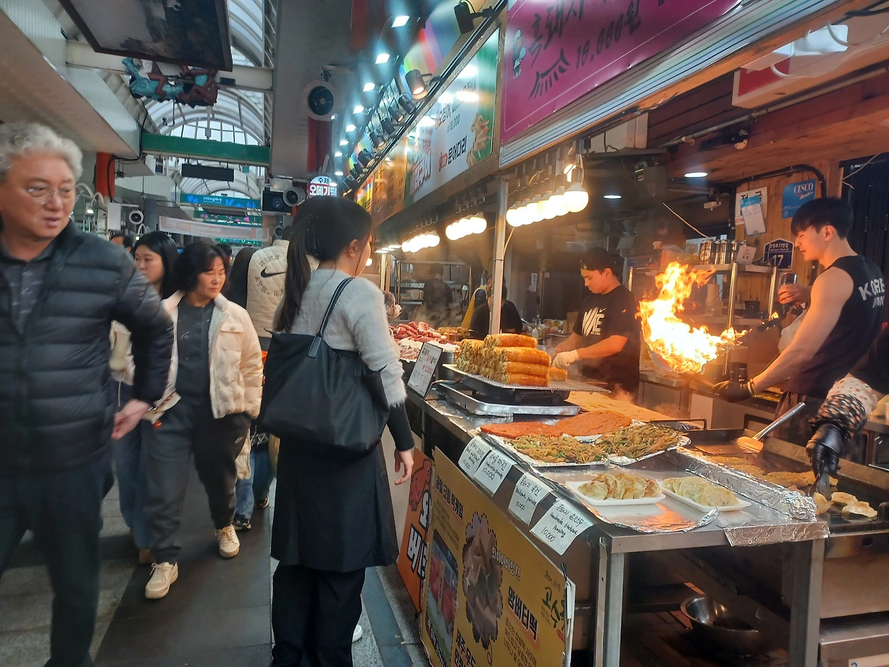 유난히 바글대는 즉석 시식코너에서는 전복 김밥, 흑돼지 육전, 해물 파전, 오징어 버터구이 좌대 앞에서는 한바탕 불쇼가 휘리릭 번진다.