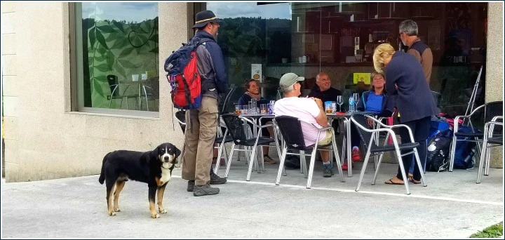 카페에서 휴식 취하며 담소 나누는 순례객들과 더불어 애견 데리고 걷던 프랑스 아저씨도 거기 한몫 낀 모습도 찍고.