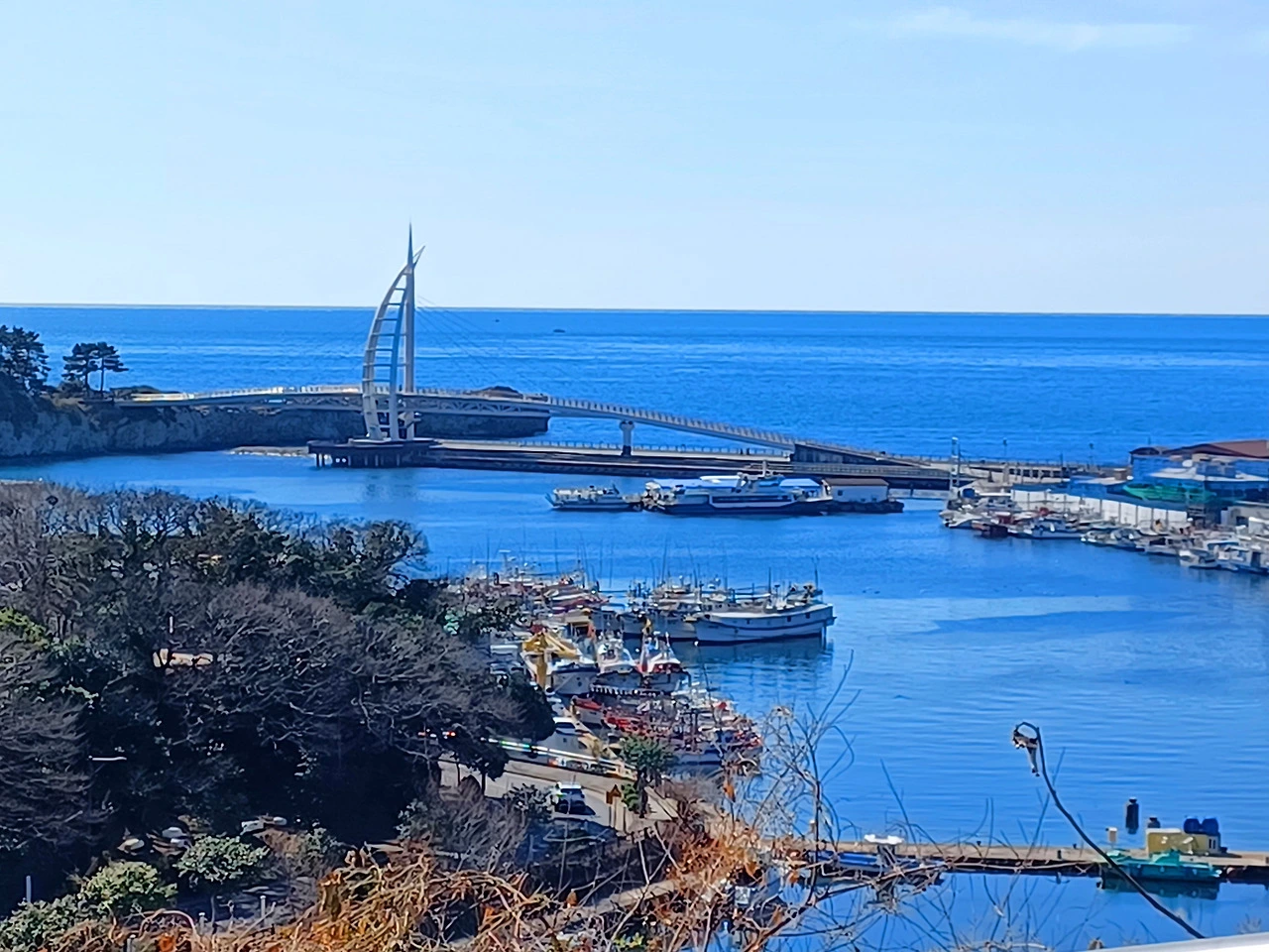 새연교와 새섬이 바로 보이는 전망터로, 바다에서 귀항하는 뱃머리가 훤히 내려다 보이겠다.