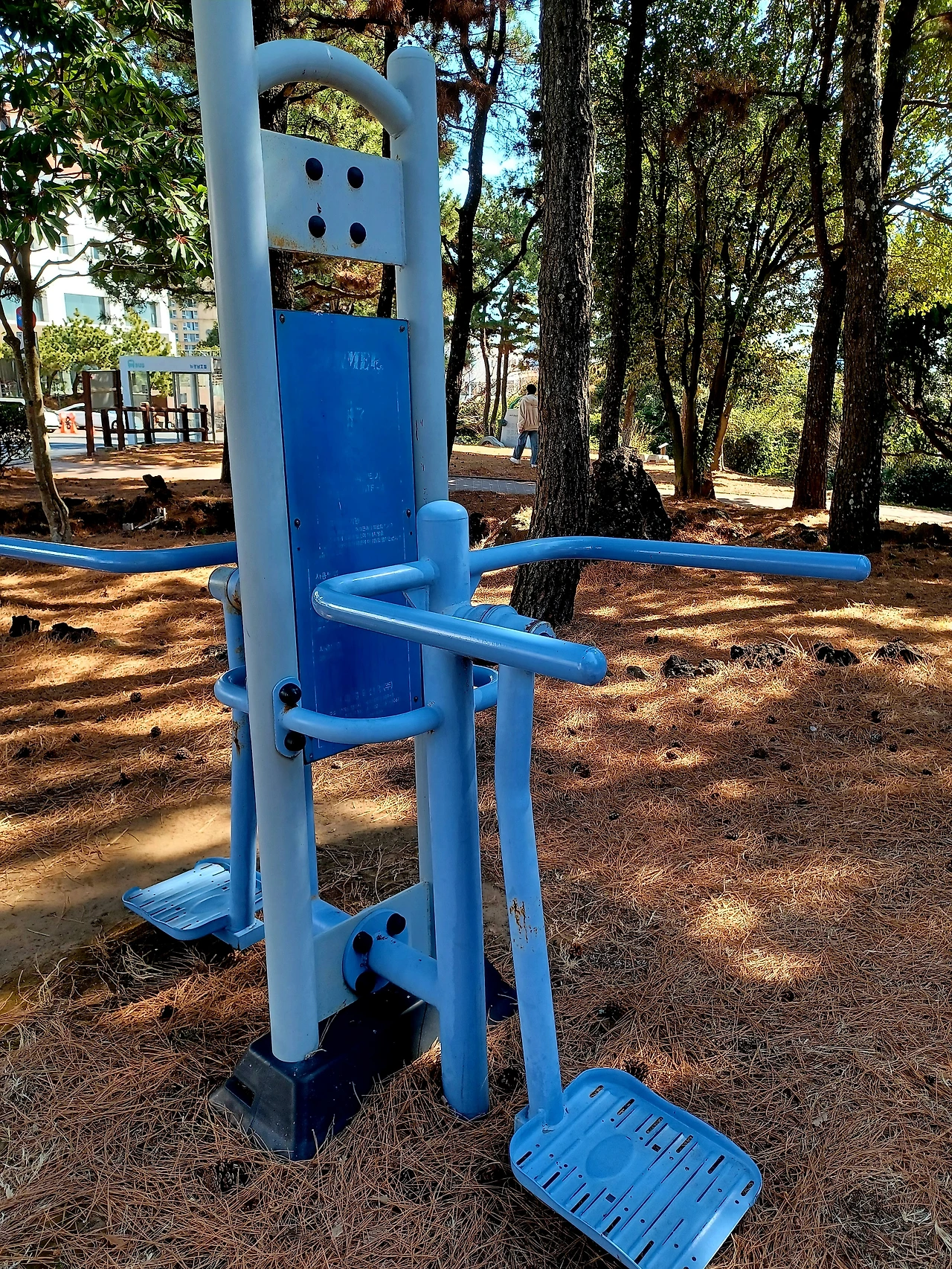 대로변에 길쭘하게 면해있는 공원, 조각물과 각종 운동기구가 솔밭에서 기다렸다.