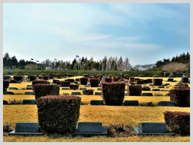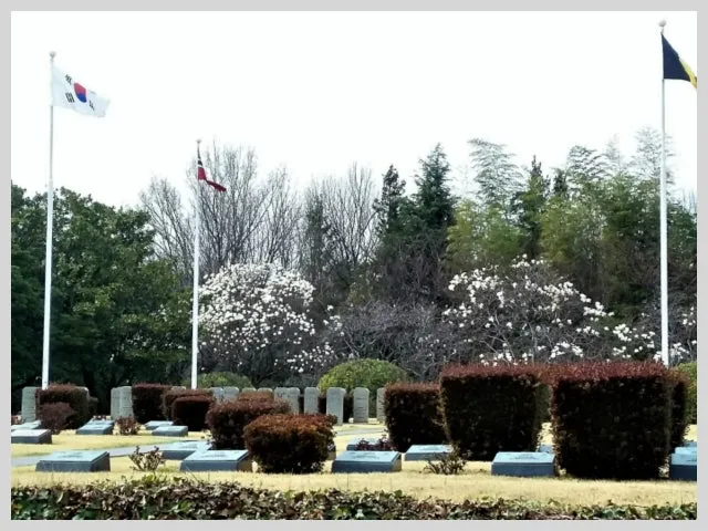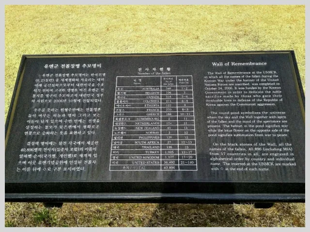 United Nations Memorial Cemetery in Korea, UNMCK는 유엔묘지라 했고 지금은 유엔記念公園이라 불리는 이곳. 한국전에서 전사한 유엔군의 유해가 안장되어 있으며 1951년에 만들어졌다. 1950년 유월, 북한군의 기습공격으로 위기에 빠진 대한민국을 구하기 위해 유엔군 산하 16개국이 전투 병력과 장비를 지원하며 참전하게 된다. 그밖에 병원선, 의료진, 의약품 등을 지원한 의료 지원 5개국, 물자 지원과 물자 지원 의사를 표명한 44개국 등을 포함하여 총 63개국이 대한민국을 방어하기 위해 참전하였다. 전국 곳곳의 격전지에서 치열하게 전투가 벌어지면서 목숨을 잃는 유엔군이 늘어났다. 이에 가매장 형식의 임시 군사 묘지를 각처에 만들었다. 밀고 밀리는 전쟁터에서 전사자는 늘어났으나 거친 지형에다 불발탄과 부비트랩의 위협 등으로 유해를 봉환하기는 어려운 상황이었다. 그렇게 1950년 6월 25일~ 1953년 7월 27일까지 참전 17개국(의료지원국 중 노르웨이 포함)의 젊은이 40,896명을 희생시킨 한국동란이었다. 낯선 타국에서 숨진 자녀 소식 접하고 비통에 빠진 어버이인들 또 얼마나 많았으랴. 풍전등화 같았던 우리나라는 이처럼 자유우방국에 이루 말할 수 없는 큰 빚을 졌다. 그 고마움 되새겨 잊지 않으며 은혜 갚는 길은 무엇일지 한국인이라면 모두 생각해 볼 일이다.