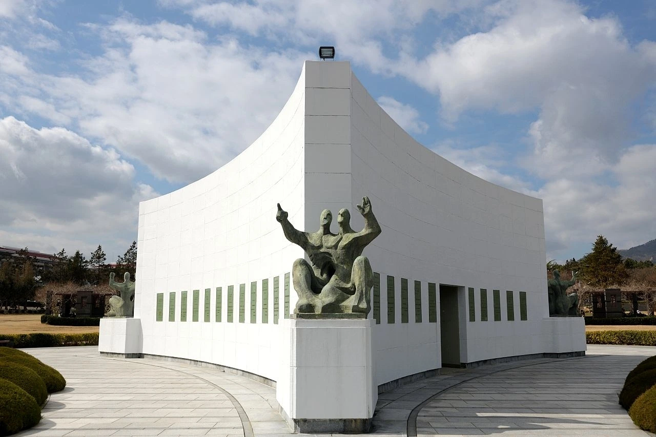정결한 젊은 영혼들의 넋인 양 순백의 매화 꽃잎 휘날리고 있는 오후. 부산 살 적에 두어 번 와본 적이 있었던 유엔기념공원을 방문했다. 전에는 삭막한 느낌이 드는 공간에 황량스레 묘비만 서있었는데, 그곳 역시 십 년이 두 번 겹치는 동안 몰라보게 변했다. 자리도 드넓게 확장된 데다 새로운 조형물도 늘어났으며 녹지가 아주 잘 정비돼 있었다. 김중업 선생이 설계한 정문 건물만은 그대로라 반가웠다., 평화를 지키기 위해 산화한 전몰장병들의 의로움과 눈물을 상징한 새하얀 정문이다. 입구의 스테인드글라스가 있는 추모관도 전 그대로였으나 그 외에는 거개가 낯선 풍경이라 잠시 어리버리해졌다. 공원이라는 명칭에 걸맞게 조화로이 수목 어우러진 정원과 산책로 잘 가꿔진 조경은 훌륭했다. 겨잣빛 하늘거리는 녹지의 수양버들 춤사위만은 평화로웠으나 유엔군 위령탑, 기념관, 무명용사의 길, 유엔군 전몰장병 추모명비 등의 조형물들은 경건한 분위기를 한층 돋구웠다.