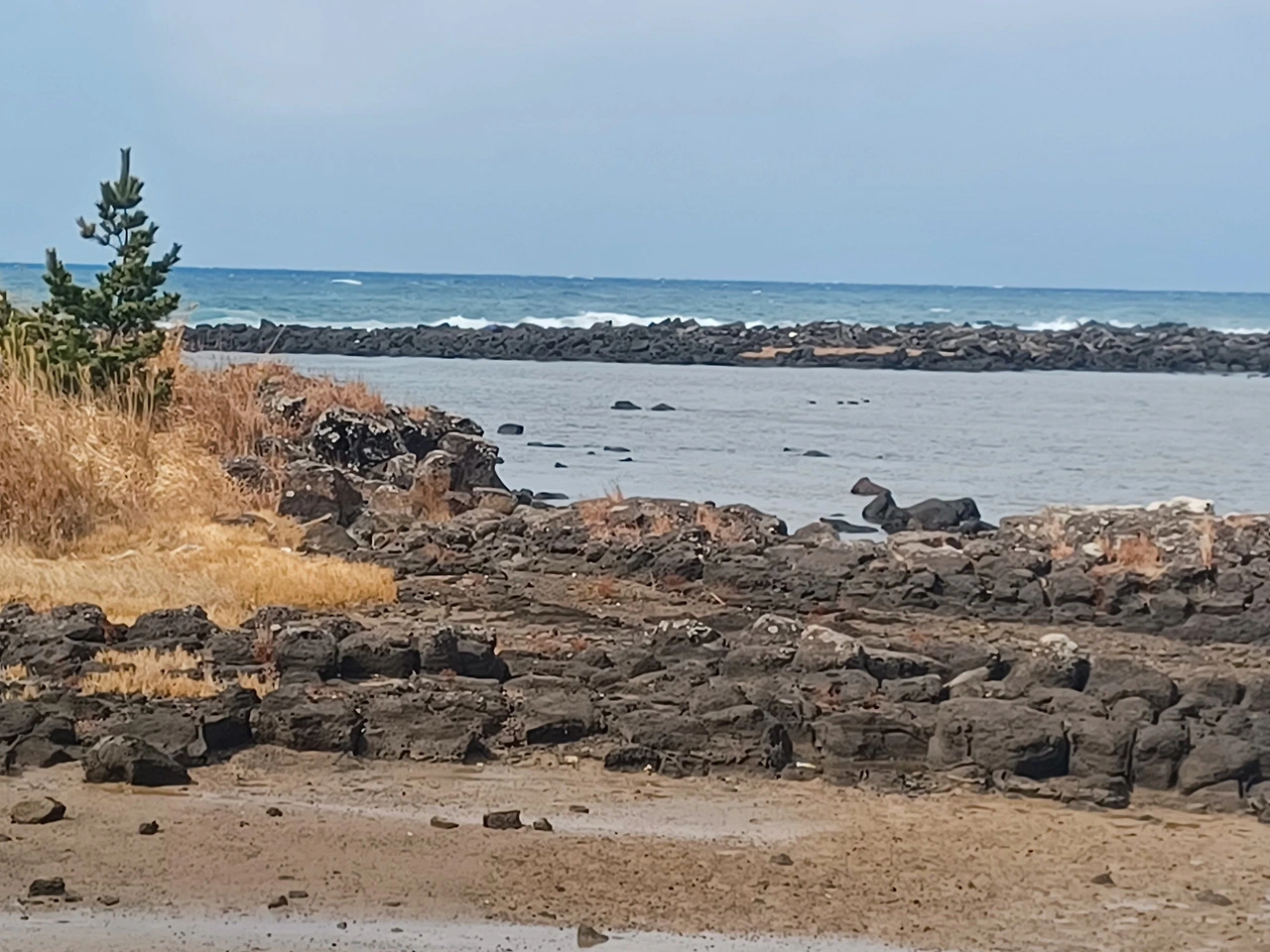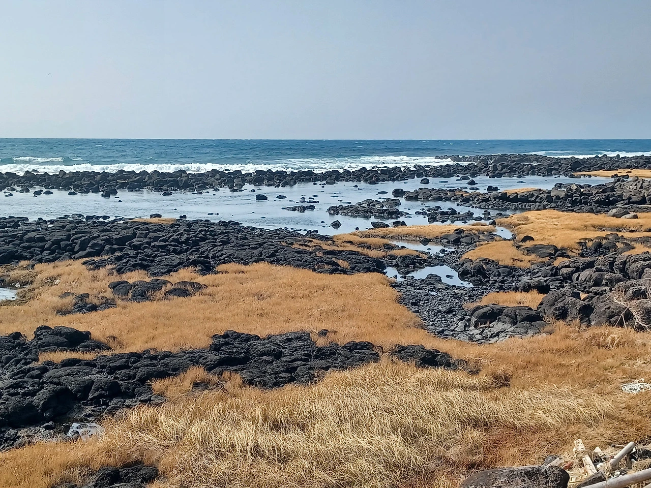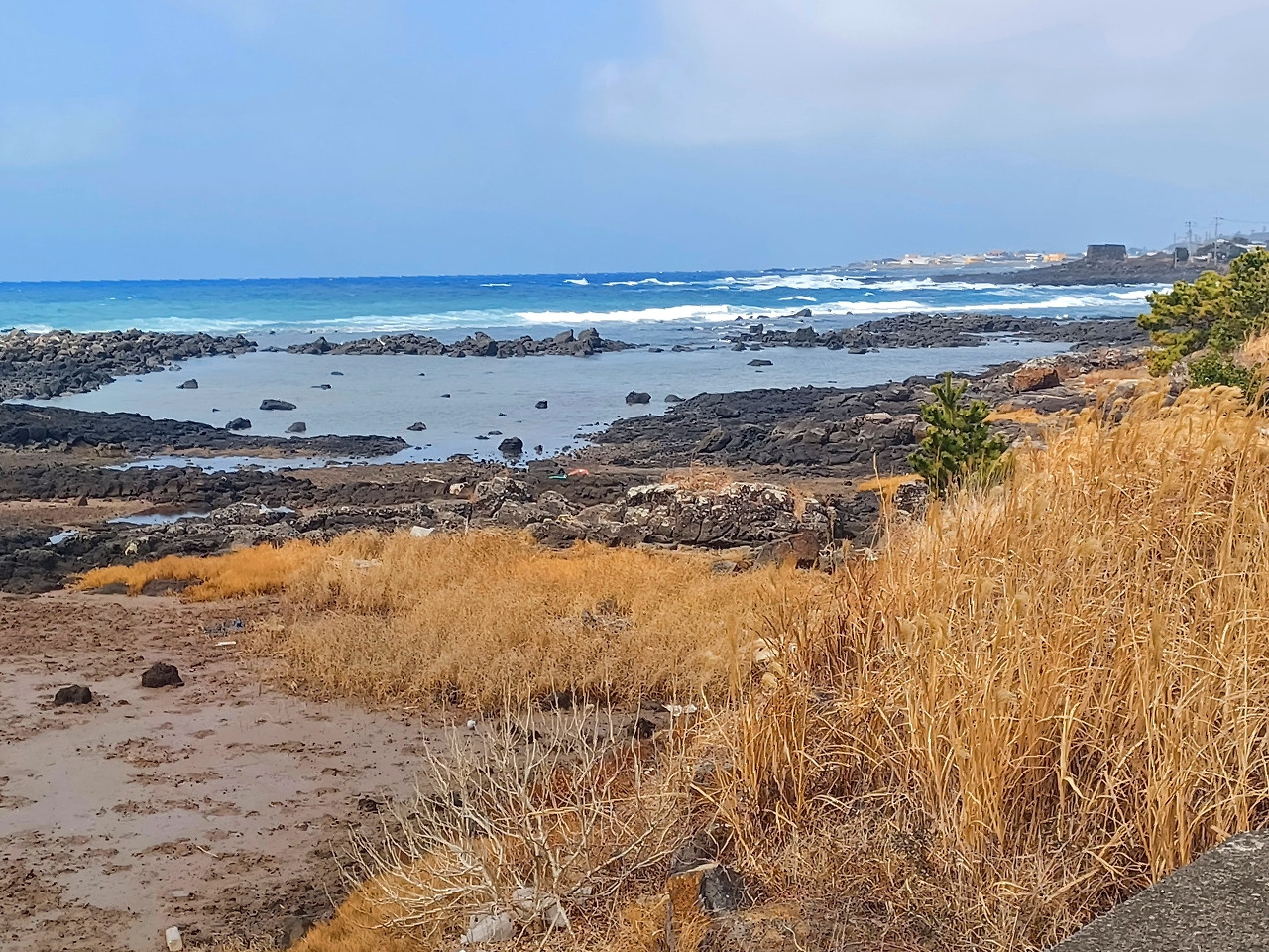 반반한 현무암 위에 뻘을 채워 바닷물을 가두었던 해안가는 무성한 갈대만 드러난 채 시퍼러이 출렁대는 바다 일색일 따름.