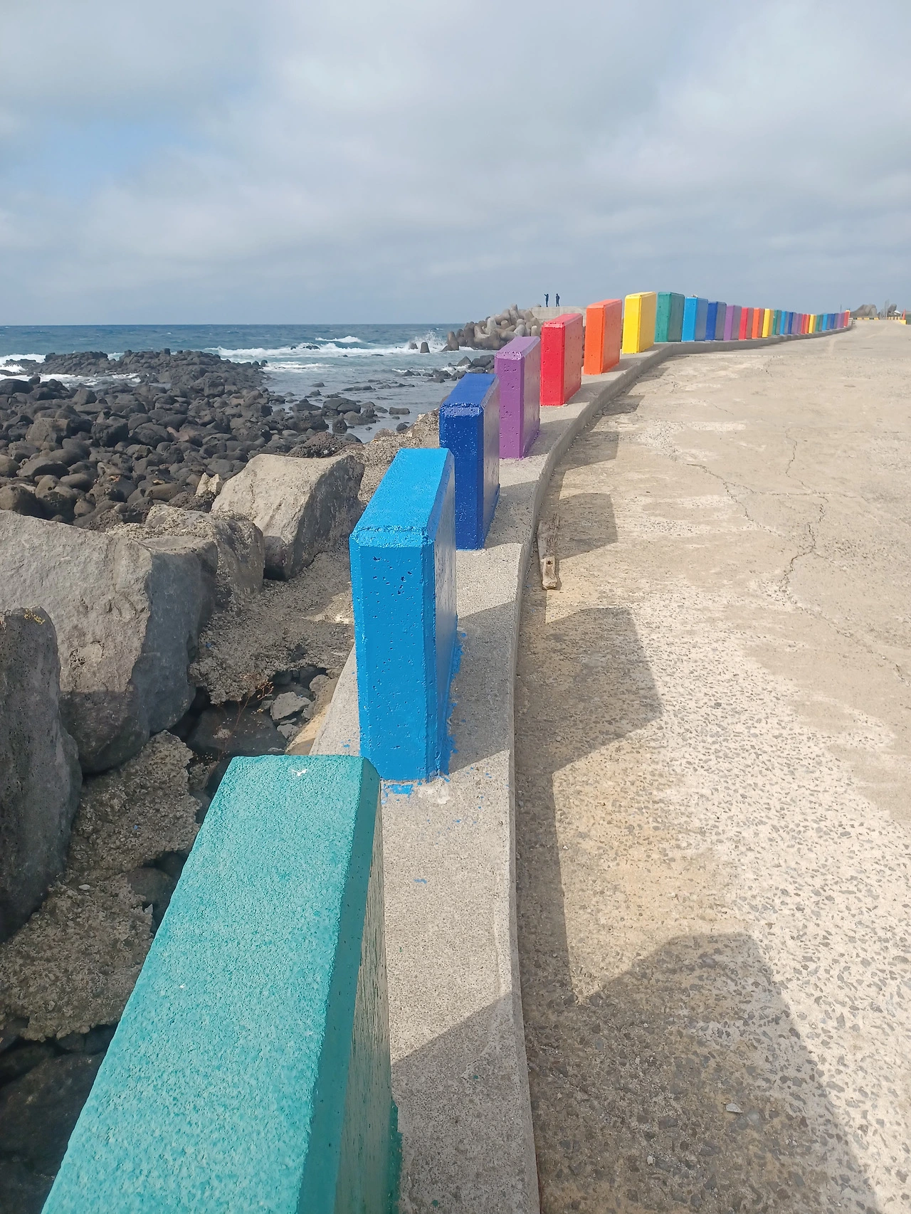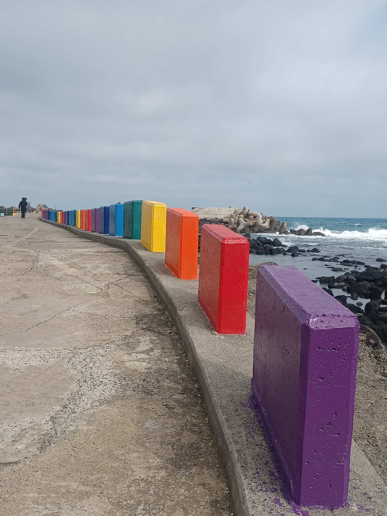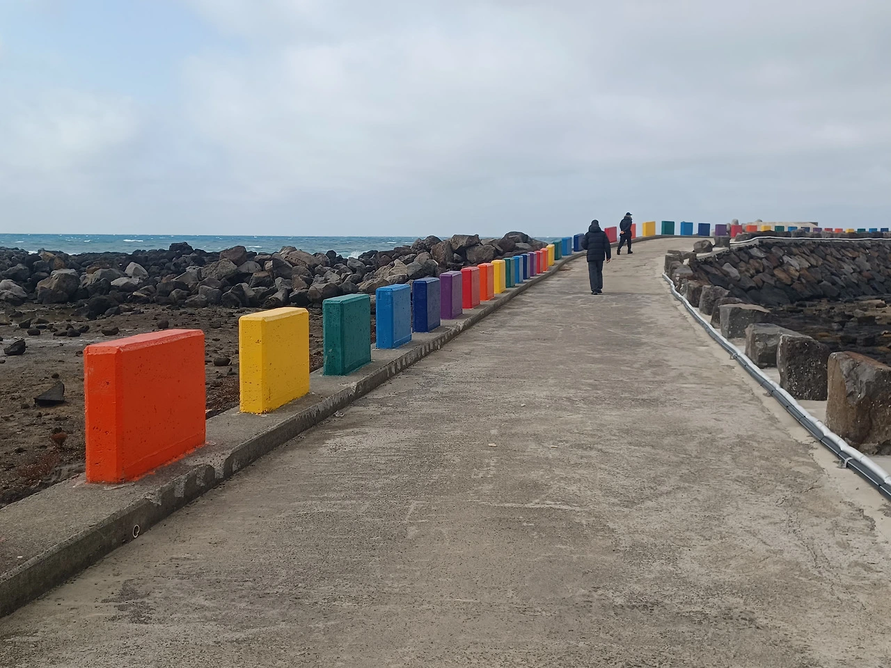 그 덕에 고래 투어를 위한 선착장 가는 길도 널찍하게 닦여있고 무지개 색으로 방책도 야물게 세워놨다.