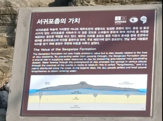 서귀포층은 이곳 절벽에 36미터만 노출되어 있지만 실제적으로는 약 100미터 두께로 섬 전역에 지하로 연결되어 깔려있다고 한다.