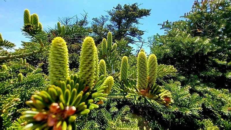 열매가 될 연두색·붉은색·검자줏빛 암꽃 사진을 검색 통해 비교한 결과 구상나무임이 거의 확실했다.