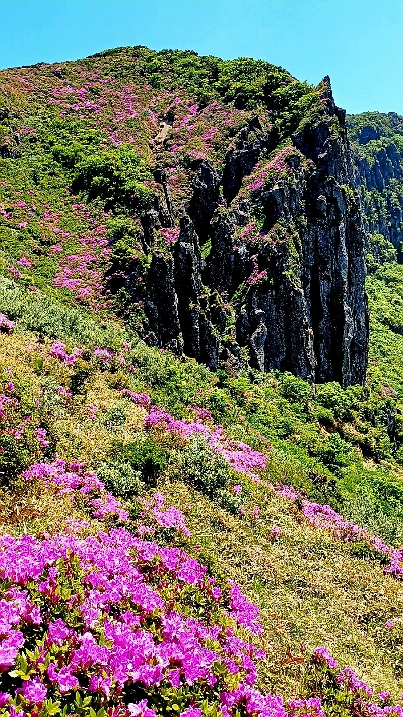 병풍바위 주변을 벌겋게 달구다 못해 슬슬 져가고 있는 진달래, 보나 마나 윗세오름은 지금이 한창일 거 같았다.