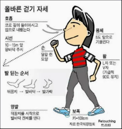 보폭은 넓게, 보행속도는 빠르게, 양 팔을 흔들며 몸의 균형을 바르게 세우고 힘차게 걷는다.