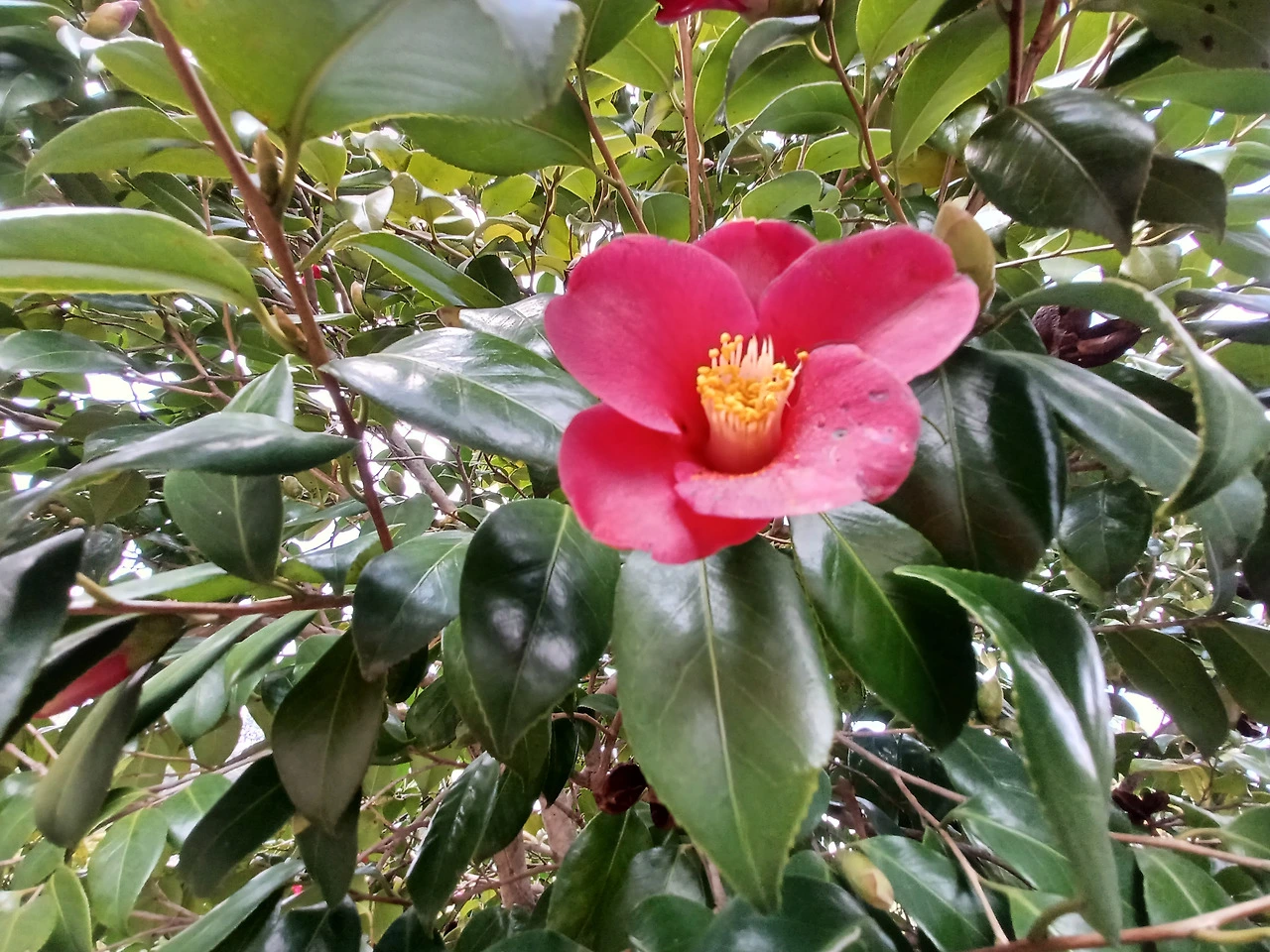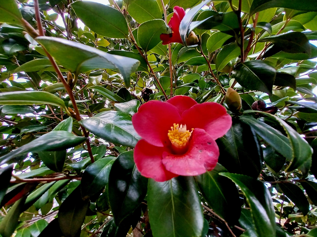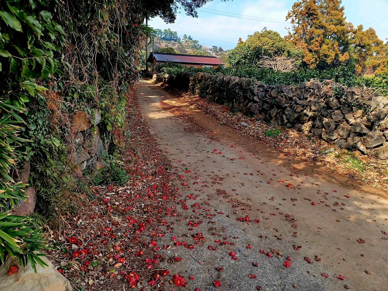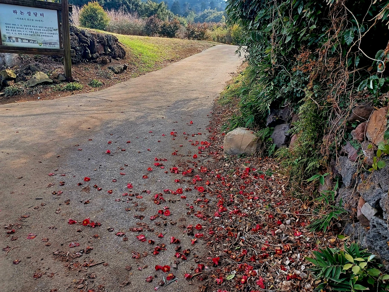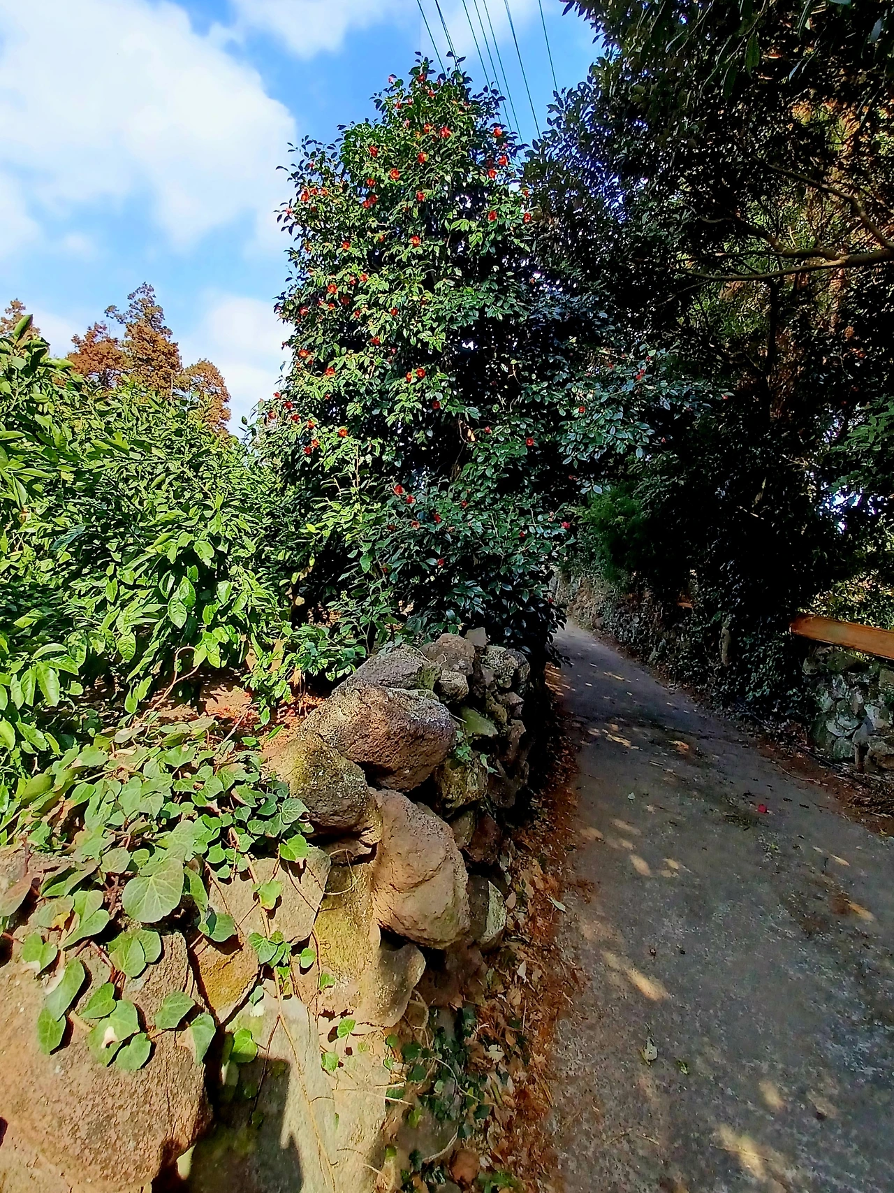 성당 옛 터 진입로에 접어들자 귤농장 양 옆으로 돌담에 기댄 동백나무 무성했다.
