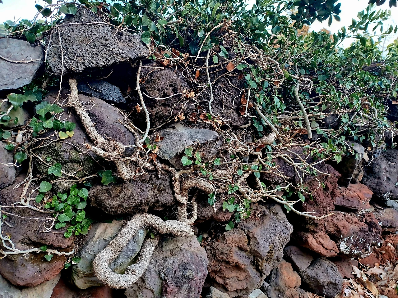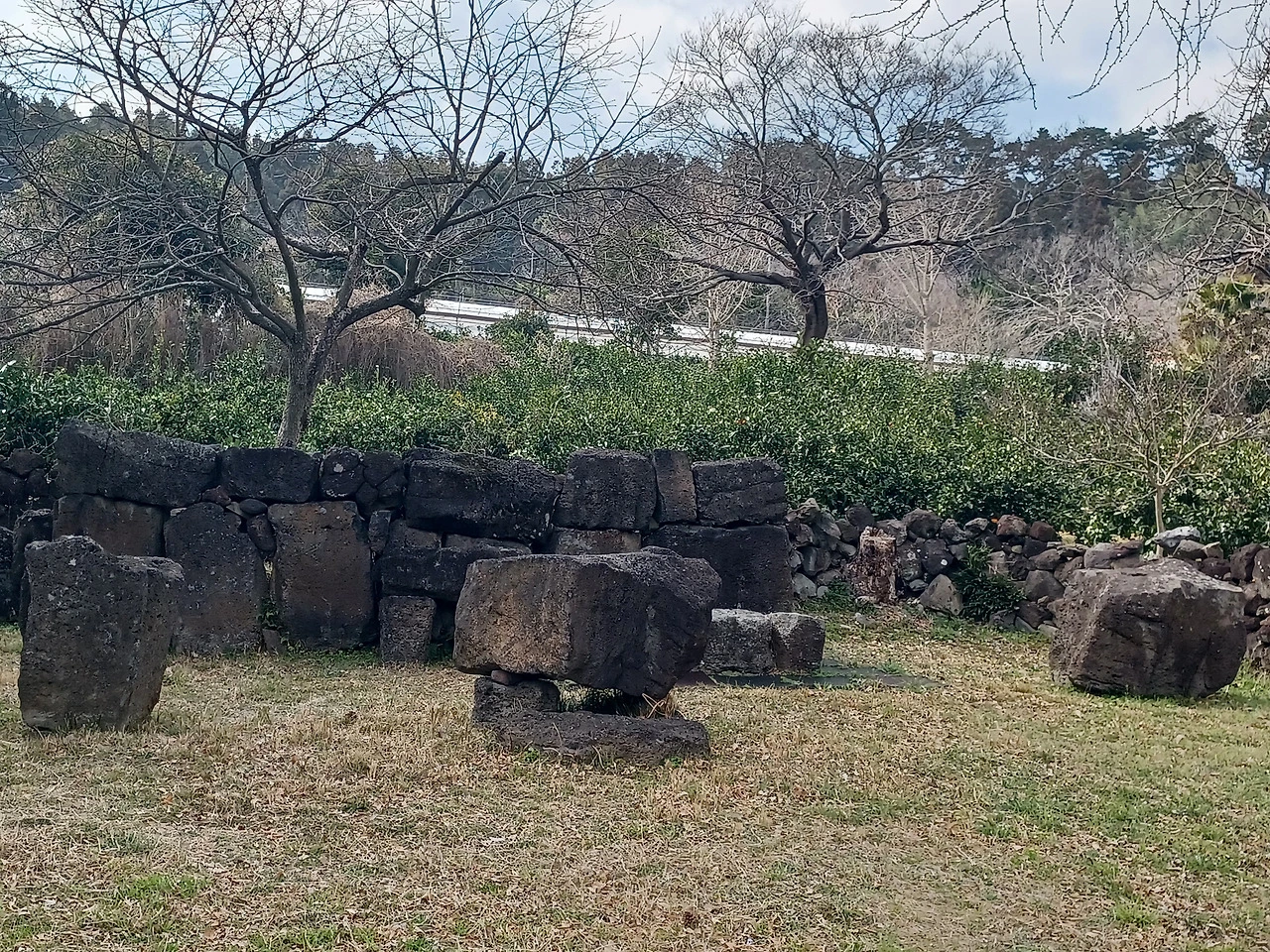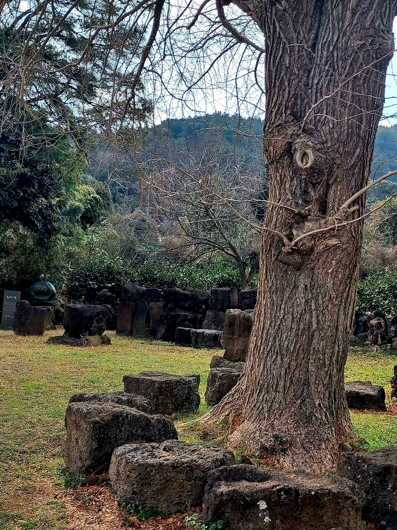 하논성당 터 입구를 지키는 은행나무 나목이라도 늠름한 자태였으며 현무암 석물로 배치시킨 제대와 독서대 묵직했다.