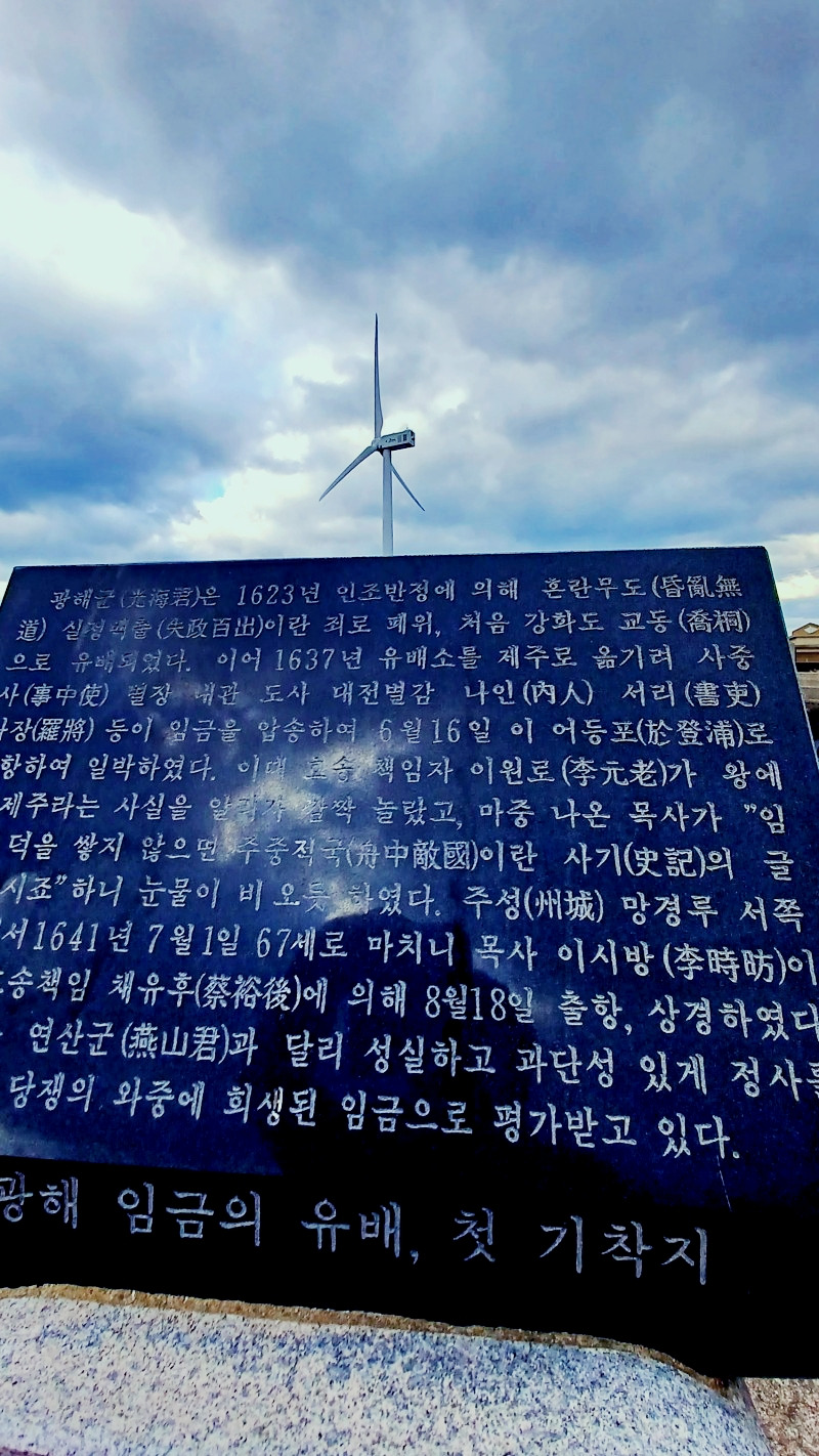 기나긴 유배생활의 와중 병자호란이 일어나자 1637년 제주로 적소가 옮겨지며 난바다 건너 어등포(현 행원포구)에 닿게 된 광해.