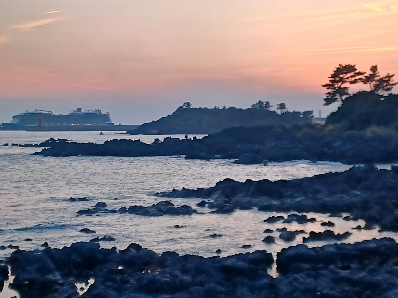 왼편 수평선 위로 멀찌감치 범섬 모습이 드러났으며 법환방파제와 강정항 크루즈도 나타났다.