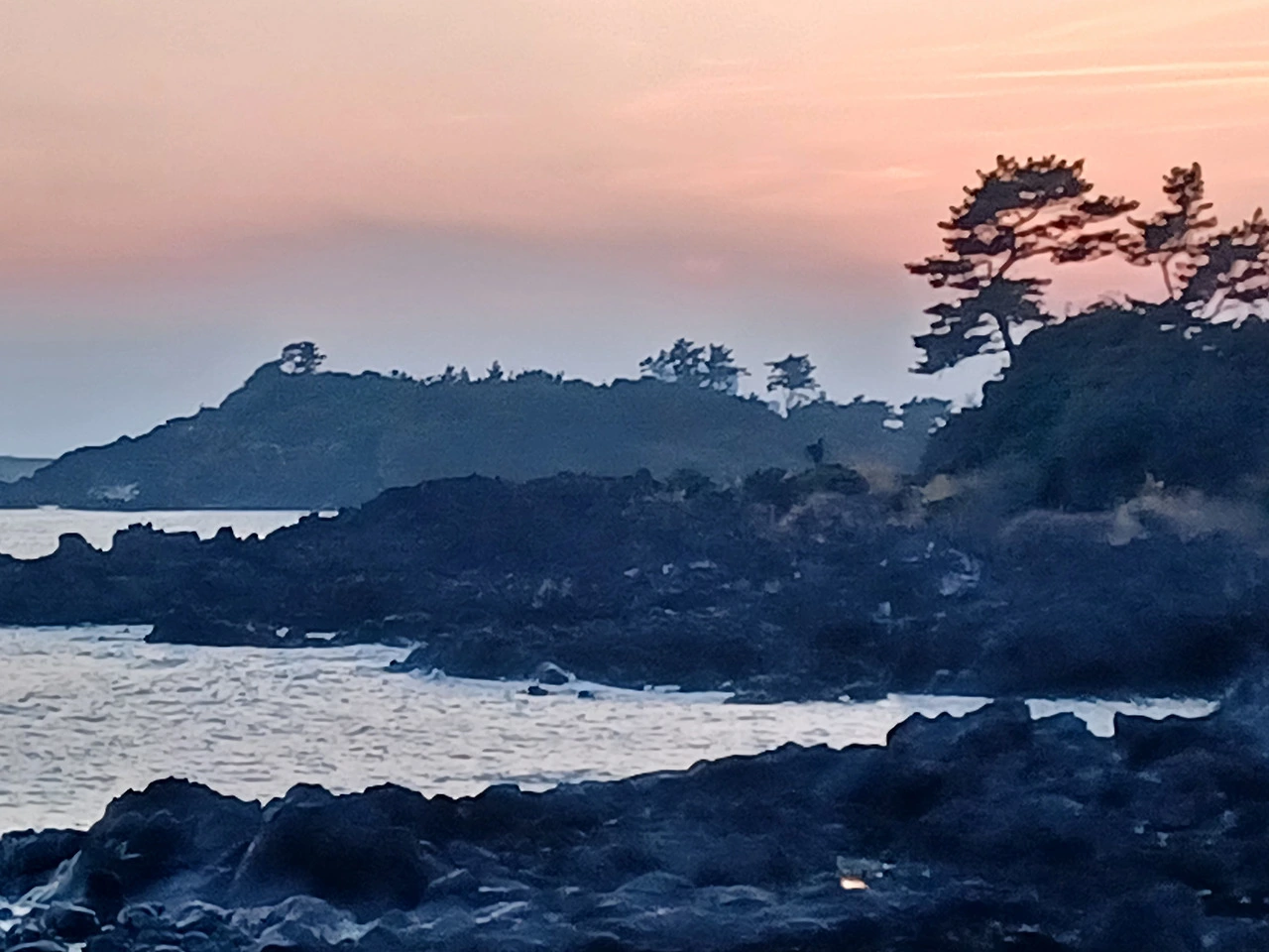 너울거리며 흔들리는 바다는 붉은 여명 더불어 하늘의 푸른 잔광 스며들어서인지 무척 어둔 색이다.