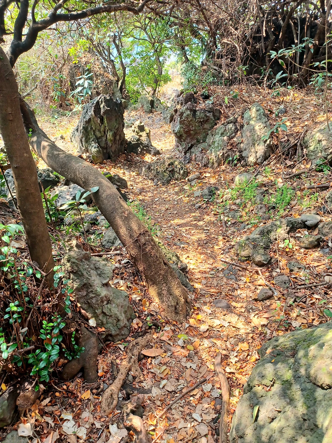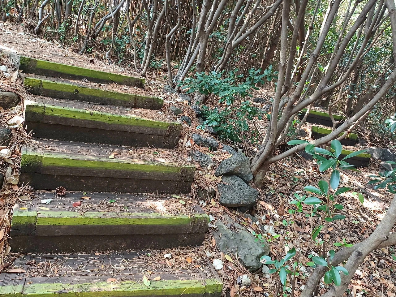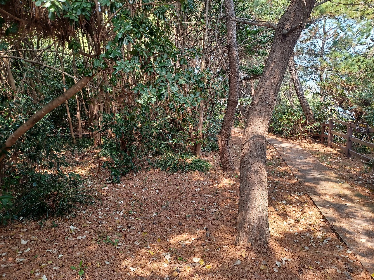 소나무, 우묵사스레피나무와 이름 모를 상록수를 비롯 덩굴식물이 얼크러진 숲은 거칠다.
