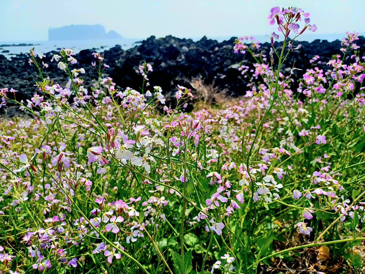 바람 고요한 듯 싶어도 해안가 갯무꽃 연보라 물결 살랑거리며 흔들리고 있었다.