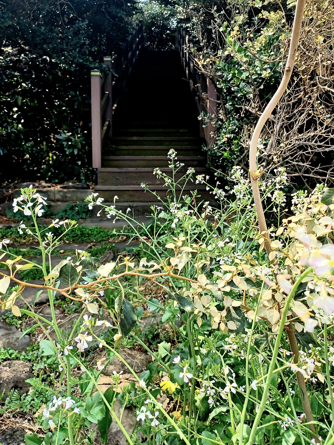 입구에 갯무꽃이 피어있었고 계단 올라서면 솔숲이다.
