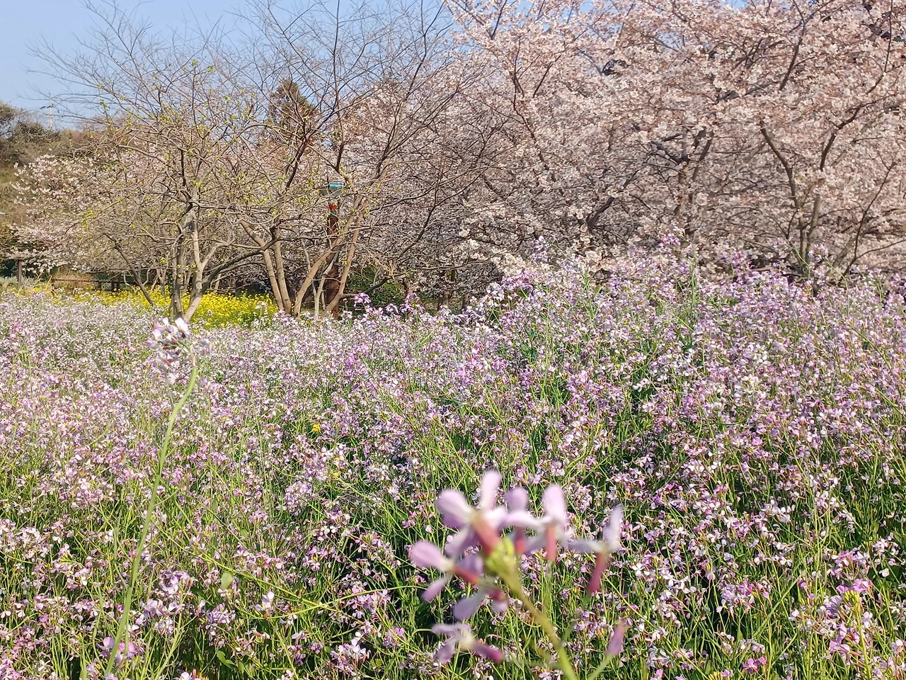 4월 첫째 주말(4월 4일~5일)엔 샛노란 유채꽃과 연분홍 벚꽃이 몽환적으로 어우러지는 초절정의 시기이다.