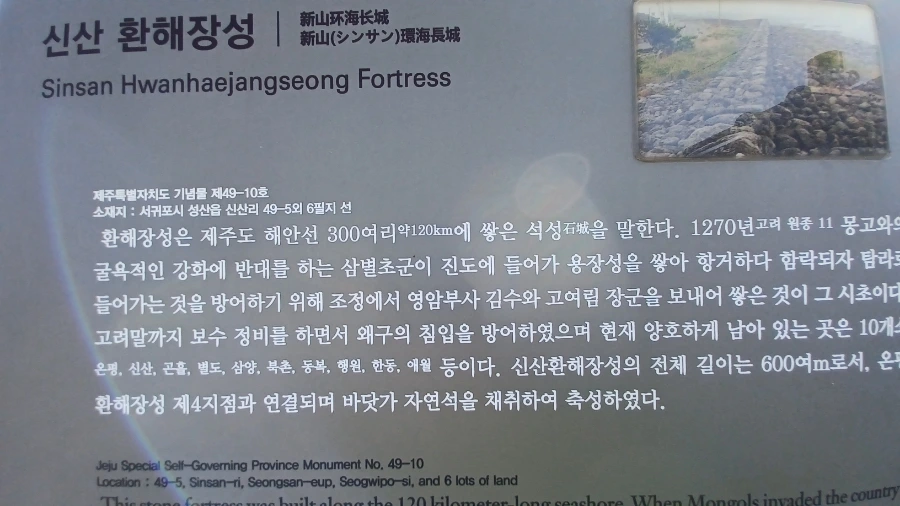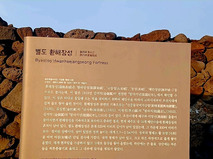 환해장성 안내문에는 이렇게 적혀 있다. "제주도 해안선 300여 리(약 120km)에 쌓인 석성(石城)을 말한다. 1270년(고려 원종 11) 몽고와의 강화를 반대한 삼별초군이 진도에 들어가 용장성을 쌓아 대몽항쟁을 전개하였다. 삼별초군이 제주로 들어가는 것을 방어하기 위하여 고려 조정이 영암 부사 김수와 고여림 장군을 보내 쌓은 것이 그 시초이다. 이후 환해장성은 고려 말부터 조선시대에 이르기까지 왜구의 침입과 18~19세기 영국 군함 등 이양선이 침범함에 따라 지속적으로 보수 정비되었다. 현재 양호하게 남아 있는 곳 10개소(제주시 화북, 북제주군의 곤흘, 별도, 동복, 남제주군의 온평)가 제주도 문화재로 지정 보호되고 있다." 지형이 험한 절벽지 같이 배를 댈 수 없는 곳 빼고는 다 성을 쌓았던 모양이다.
