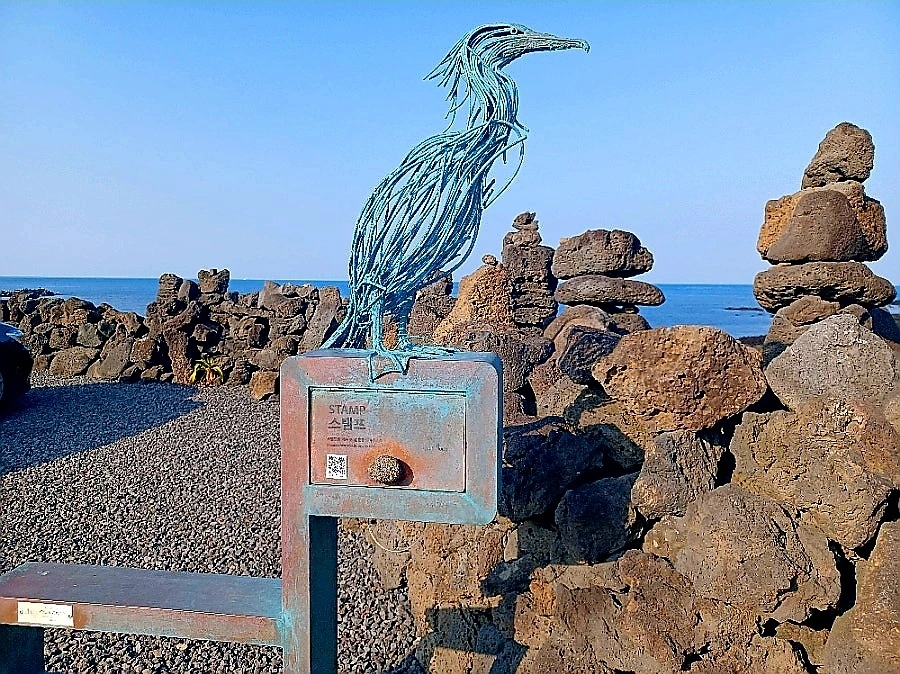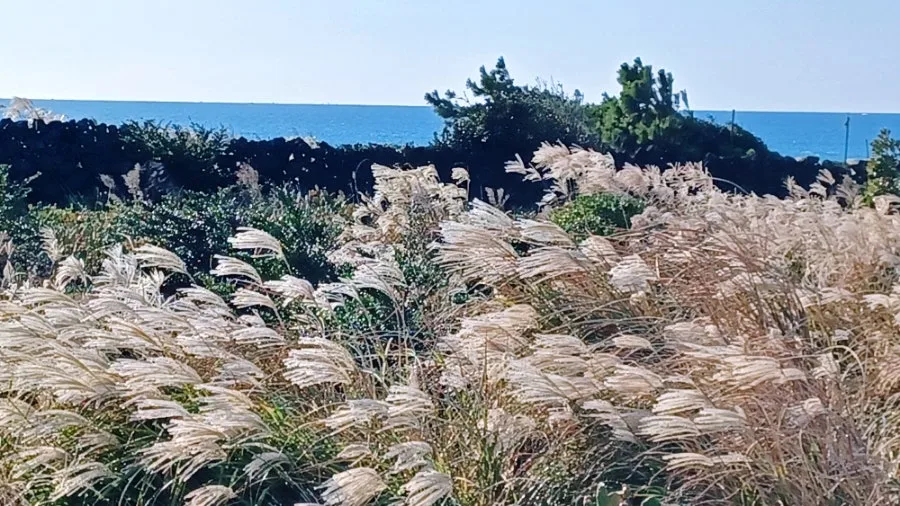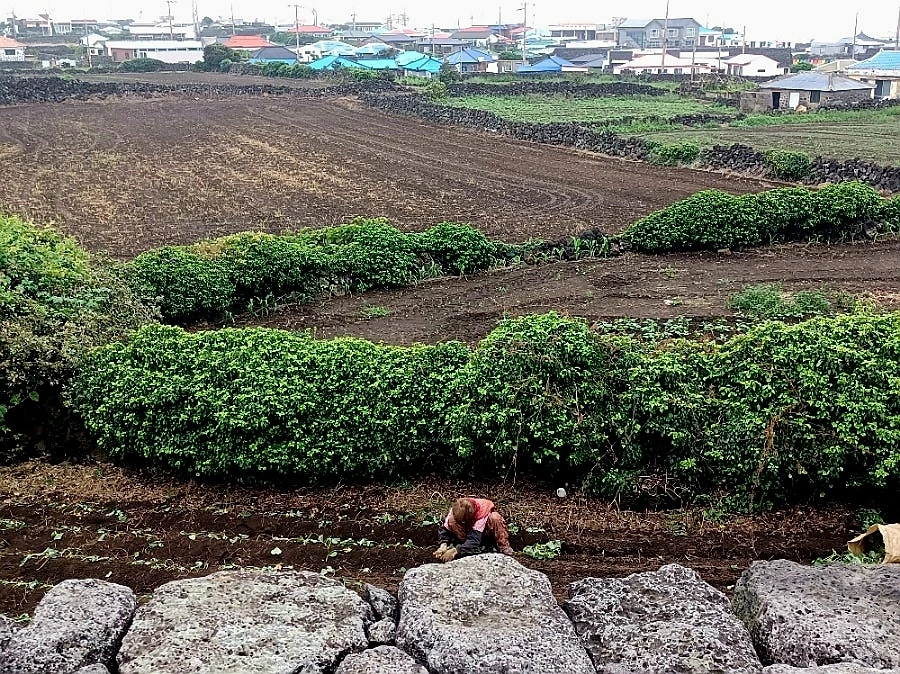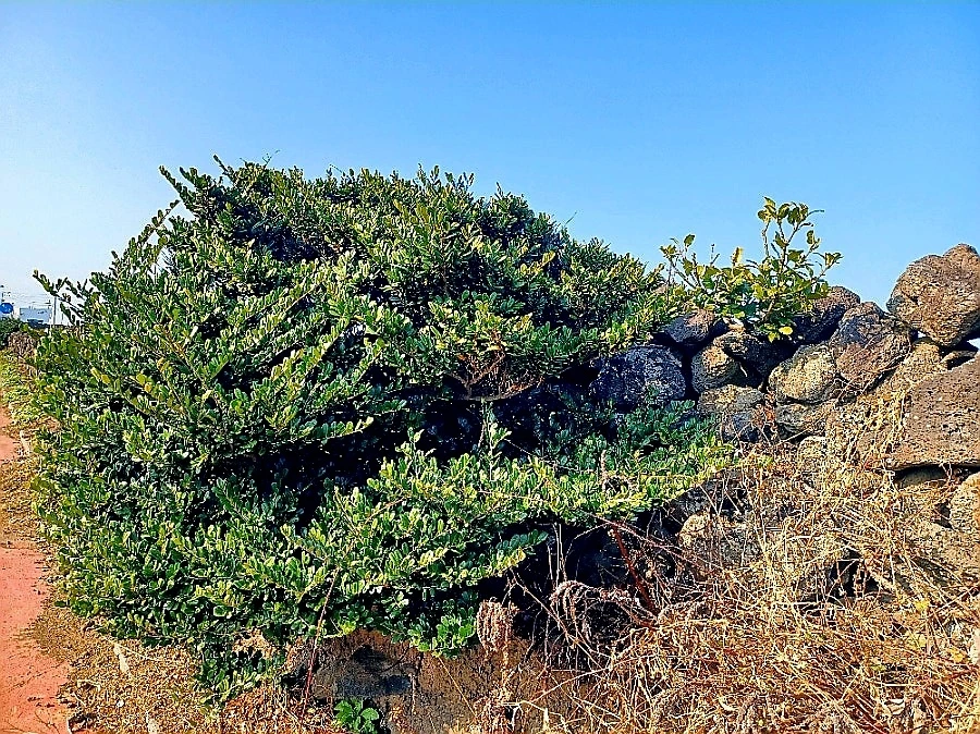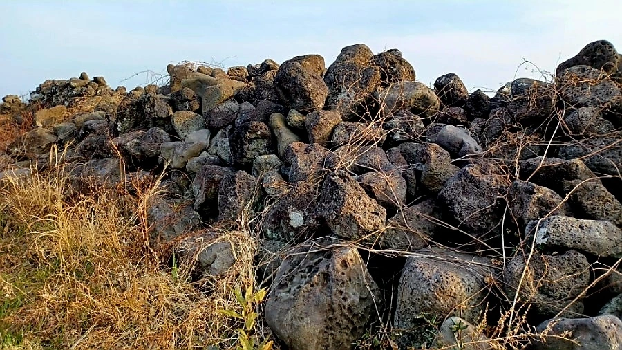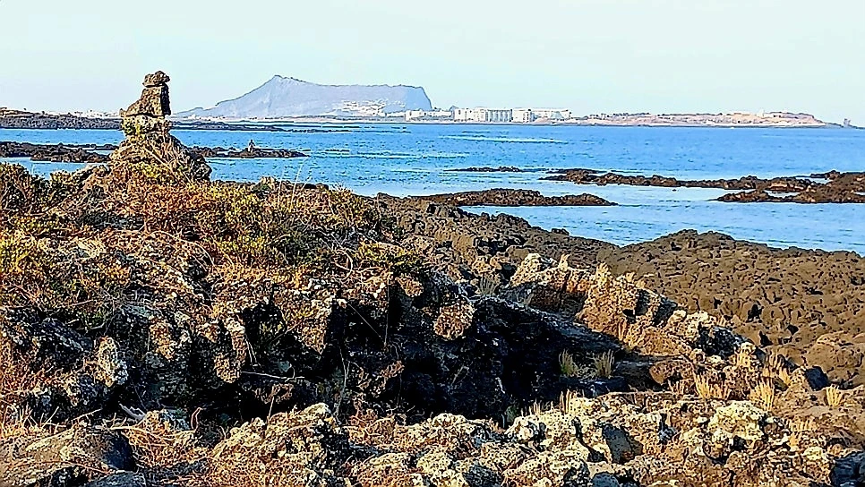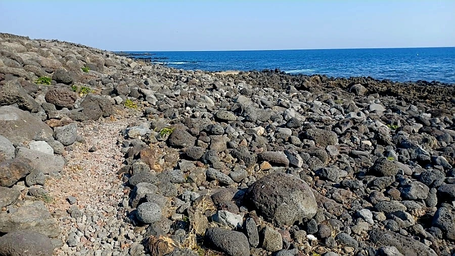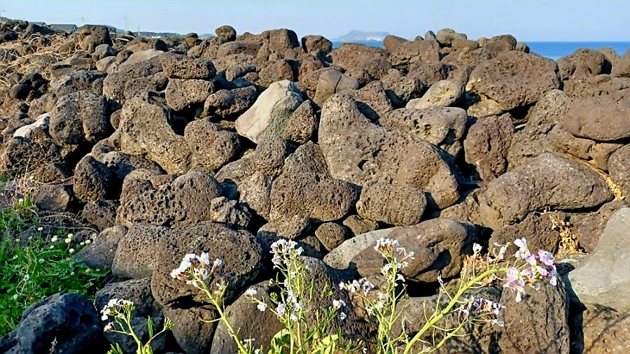 도구는 물론 입성조차 변변찮은 민초들이 맨손으로 깡추위와 염천 무더위 무릅쓰고 그 기나긴 석성을 축조했을 터다. 환해장성을 따라 해안 도로 걷는 내내, 하여 심사 짠하고도 싸해질밖에. 첫 환해장성 탐방은 동쪽 해안가였다. 신양해수욕장에서부터 시작되는 환해장성로는 온평포구 거쳐 신산리까지 10킬로쯤 이어지며, 돌아서면 성산일출봉이 우련하다. 내친김에 남원 태흥마을길 따라 휘적휘적 걷는 동안, 무너져 내린 혹은 복원된 석성 바라보는 마음 영 묵지그레했다.