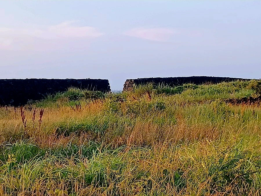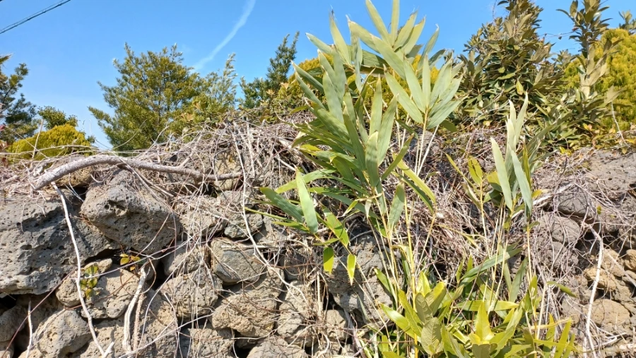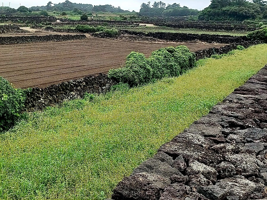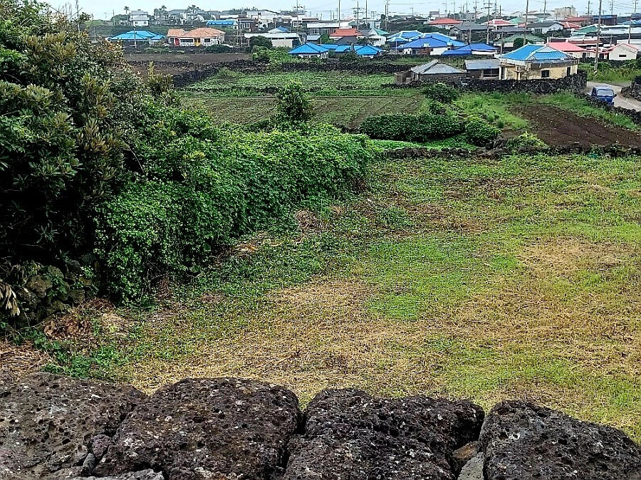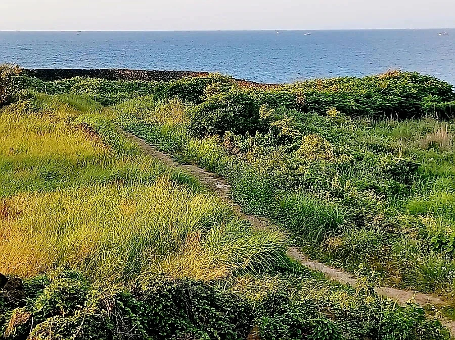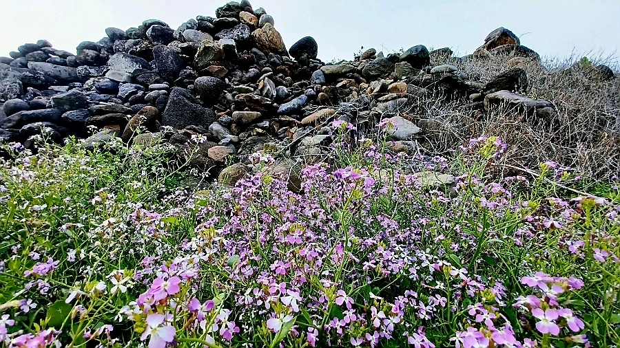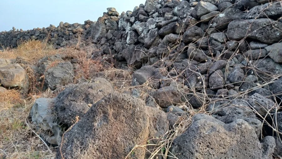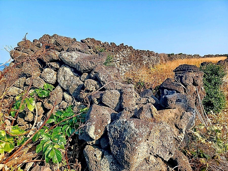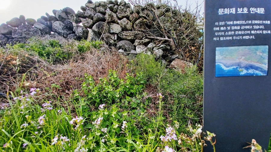 그 외 현존하는 환해장성 가운데 왜구와 맞선 치열한 흔적은 화북포구에 남아있다. 별도연대 아래 단단하게 쌓은 환해장성, 창망하기 그지없는 화북포구는 그만큼 외부 적들의 잦은 침공 루트였다. 총 해안선 길이 254km인 제주섬이다. 현무암 거친 해안이라 배를 대기 어려운 지형을 빼고도 거룻배라도 접안할만한 곳이라면 어디든 석성 쌓아 올린 섬사람들. 그러하듯 또 한 곳 환해장성이 기다리는 장소는 군산 아랫동네다. 콸콸 솟는 용천수가 바다로 흘러내리는 길목에, 민물과 갯물이 만나기 직전 형성된 천연 해수욕장이 논짓물이 나온다. 놀멍쉬멍 온갖 것 두루 살펴 가며 그렇게 예래해안로를 따라 설렁설렁 걸었다. 때는 봄이었다. 난드르 길가에서 환해장성 안내판이 눈에 띄었다. 허물어지긴 했지만 장성의 자취가 제법 길게 남아있었다. 오히려 옛 흔적 그대로인 무너진 터에서 옛적 긴박했던 현장감은 더 선명히 읽힌다.