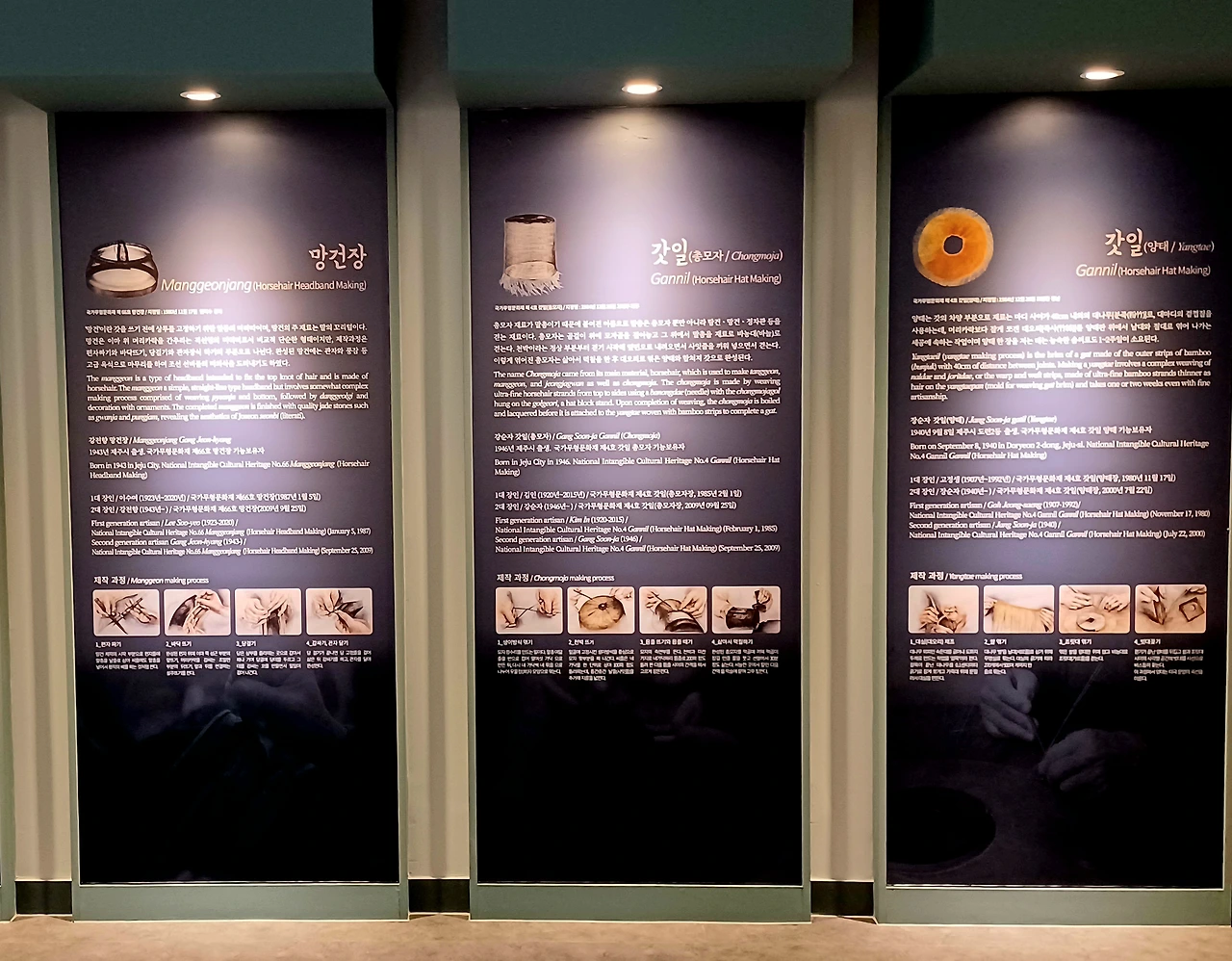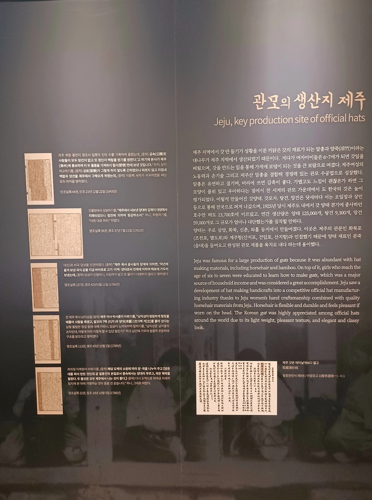 갓의 다양한 종류를 비롯해 역사와 구조 변화, 제작 도구와 기술(갓일) 과정 등을 기록물과 사진 및 영상 통해 자세히 소개한 이 전시관.