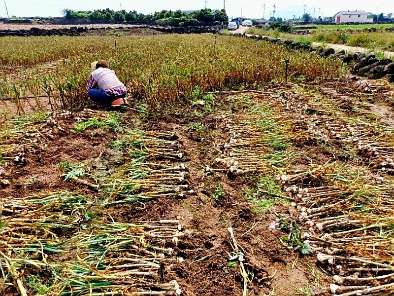 이른 아침, 서귀포에서 중문 안덕 모슬포를 거쳐 대정 마을 비포장도로 돌고 돌아 아홉 시에 도착한 마늘밭.