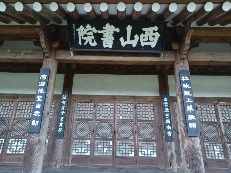 중앙 높직이 유생들이 학문에 정진하던 규모 가장 큰 강학 공간인 숭의당, 서산서원 현판이 마주 보인다.
