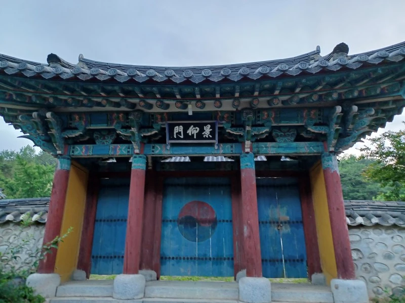 숭의당 건물을 휘돌아가면 뒤편에 태극 문양 선연한 내삼문인 경앙문이 나서는데 사당이라 그 안의 충의사는 지붕만 보일 따름.