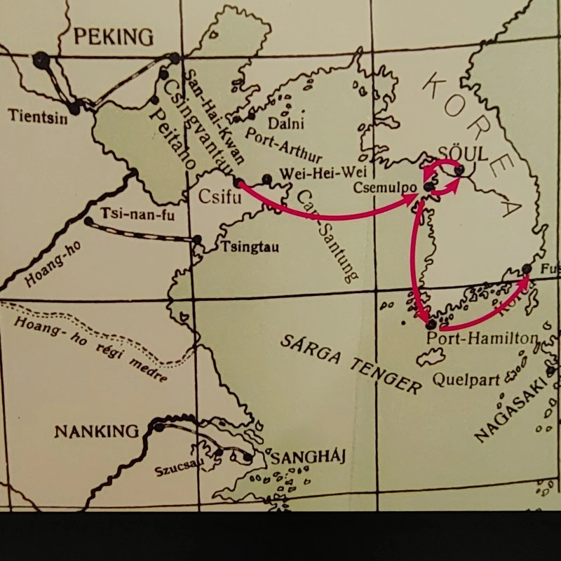 "한양에 온 우리 일행은 덕수궁 옆에 위치한 프랑스인이 운영하는 팔레스 호텔에 묵으며 궁궐을 여행했다. 주인 없는 경복궁 마당의 연못에는 잡초만 무성하여 모든 것이 죽음을 연상시켰다."