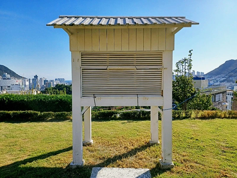 하얀 나무집인 백엽상: 안에 디지털 온도계가 설치되어 있으므로 직사광선을 받아도 내부에 열기가 차지 않게 조성된 환경이라고