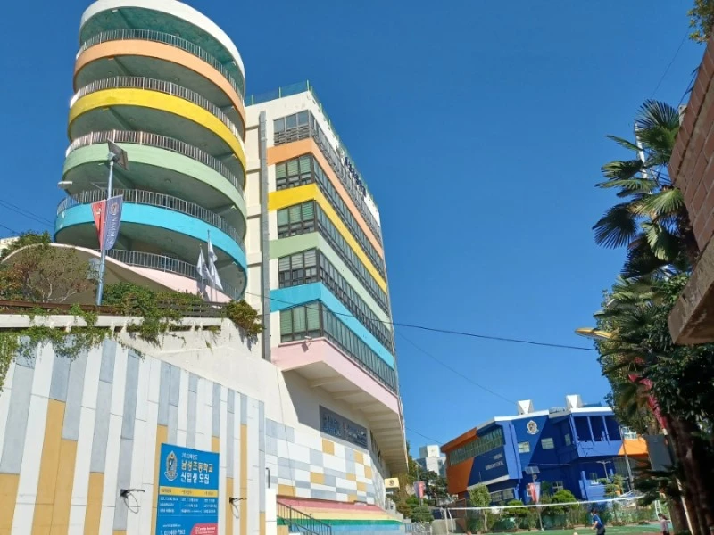 엘리베이터에서 내리자 무지개처럼 산뜻하게 페인팅된 남성초등학교가 보이고 맞은편엔 부산타워가 고개 내민다.