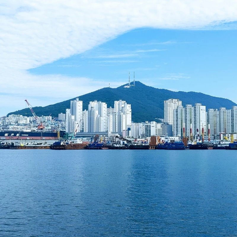 영도 봉래산이 마주 보이고 그 발치에 어지러운 조선소 대형 크레인과 선박들, 부산대교와 영도다리 한켠도 드러난다.