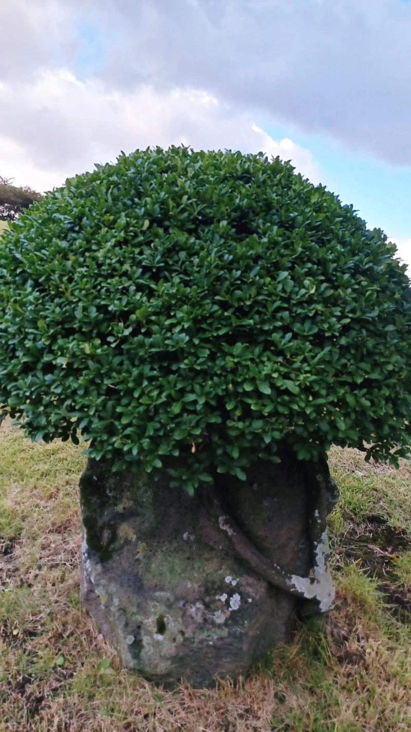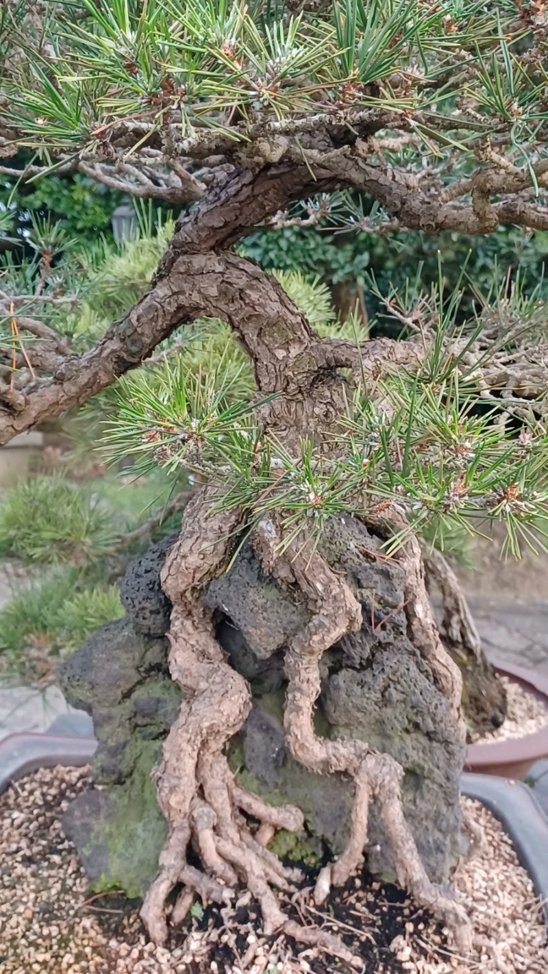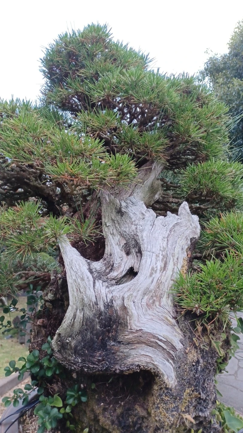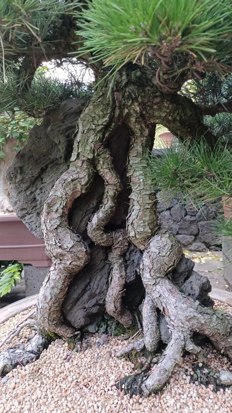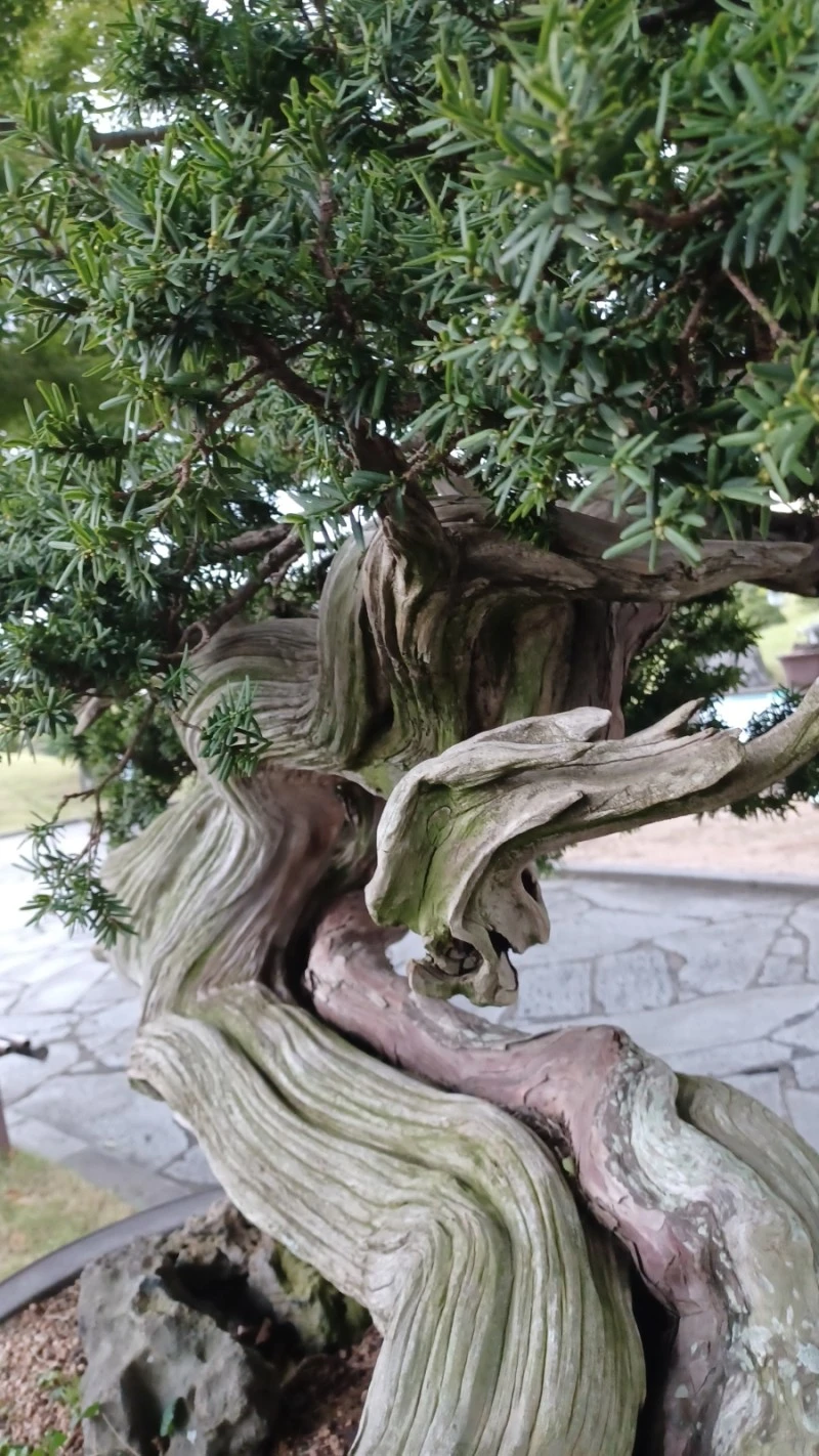 이곳 정원에는 살아있는 줄기와 죽은 줄기가 서로 어울려 휘감고 있는 절묘한 주목, 뿌리 부분 하얗게 드러난 곰솔 휘굽은 몸체 등 귀물이 다수 보였다.