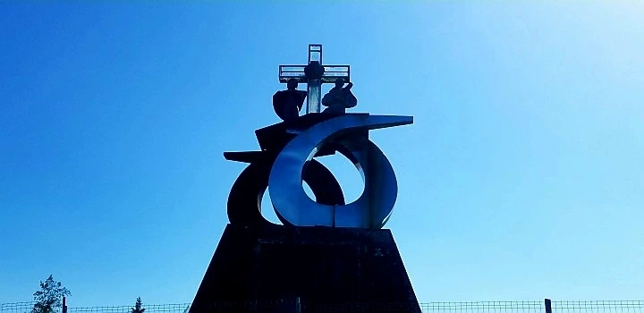 콩코르티야 까미노 공원의 철제 조각 앞에서 산티아고 자취 찾아 두리번거리자 멀찍이 도시 윤곽이 잡혔다.
