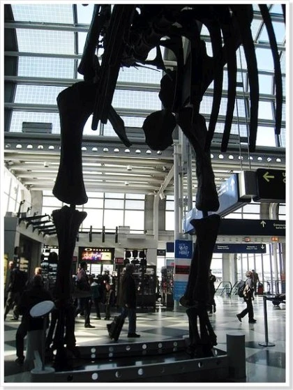 비행기표를 야무치게 쥐고는 일단 오른쪽으로 곧장 직진ㅡ> 한참을 걸어도 B 구역은 쉬 끝나지 않는 데다 정작 C란 알파벳은 눈에 띄질 않는다. 약간 초조해진다. 스쳐 지나는 수많은 사람들은 어물거리며 물어볼 여유를 주지 않고 제각기 바쁘게 걸어간다. 그때 저만치에서 내가 찾던 알파벳이 보이고 뒤로는 우뚝 선 큼지막한 공룡화석이 나타난다. 그제야 아하~~ 소리가 절로 터진다. 그림 속의 동물이 바로 너, 이 동물 골격이었구나!!! 공룡 맞은편 층계로 내려가 지하도를 아주아주 한참 지나 건너편 건물에 올라서니 드디어 필라행 탑승구인 C-25 앞에 이르게 되었다. 비로소 안도의 깊은 호흡, 휴우~