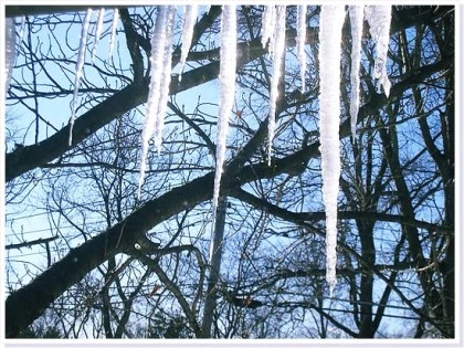 창밖 체리나무 가지와 추녀에 달린 고드름